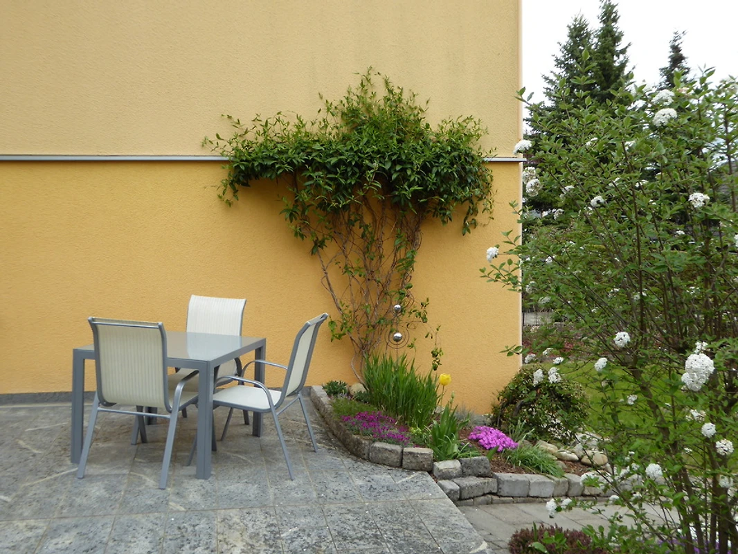 Przed mieszkaniem znajduje się mały umeblowany taras z widokiem na ogród, zapraszający do relaksu lub śniadania.
