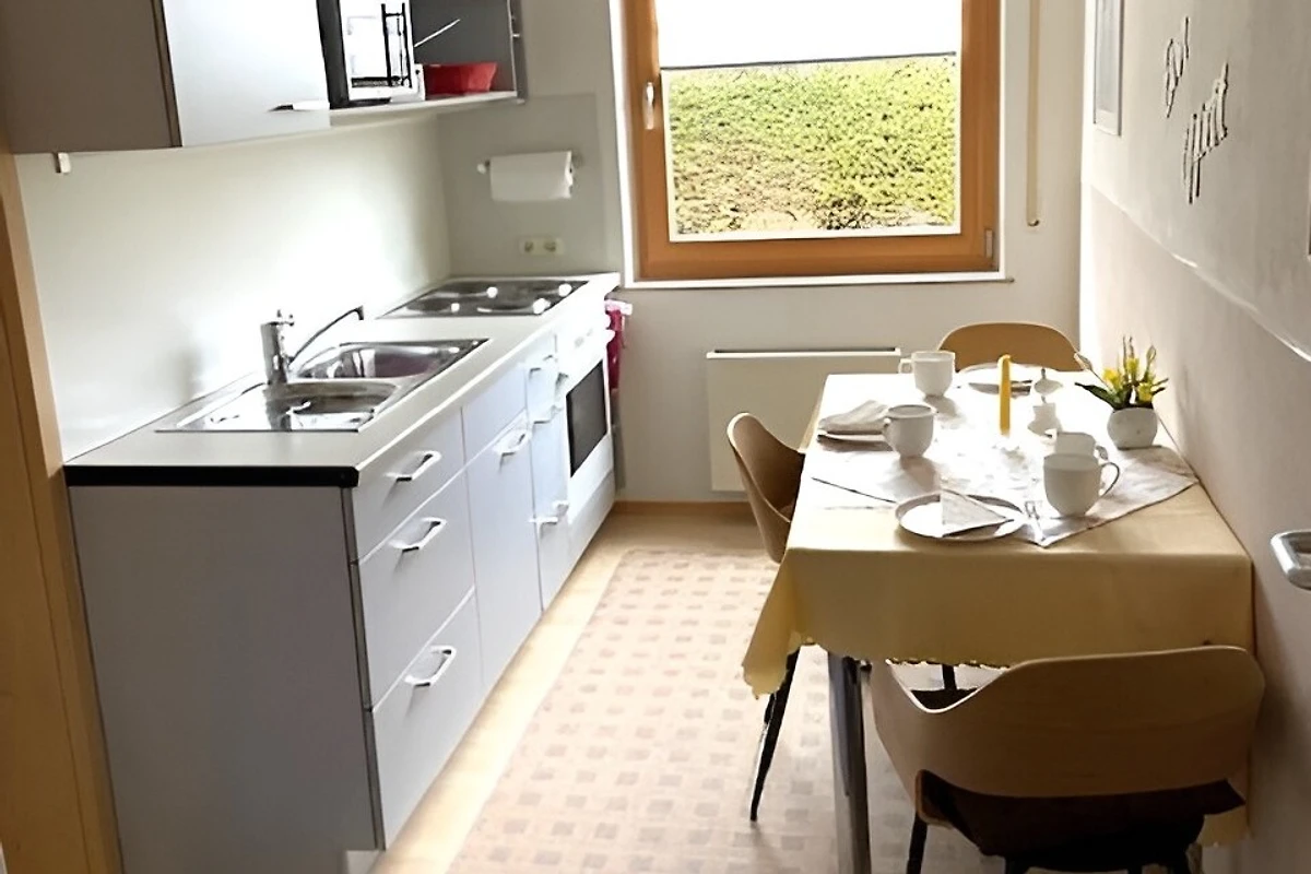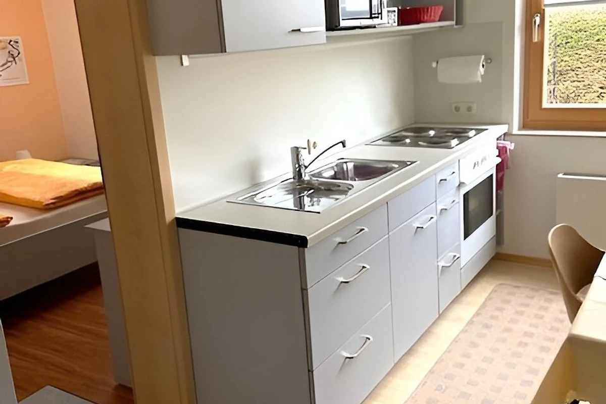 Do apartamentu prowadzi osobne wejście. W pełni wyposażona kuchnia oferuje Państwu kuchenkę mikrofalową, piekarnik, ekspres do kawy, na życzenie ekspres NESPRESSO, czajnik, toster, radio oraz mały kącik jadalny.