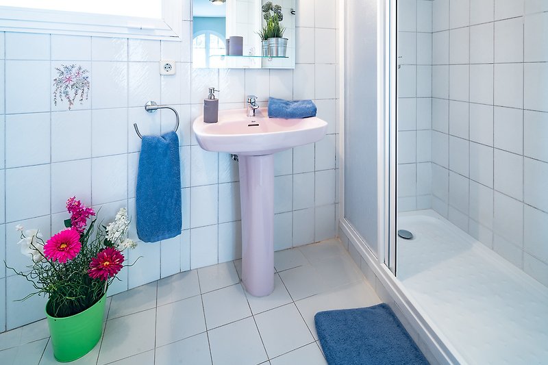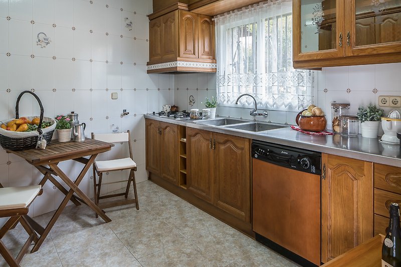 Na parterze znajduje się przytulny i jasny pokój dzienny z jadalnią i kominkiem (bezpośredni dostęp do basenu), w pełni wyposażona kuchnia, 2 pokoje (jeden pokój z jednym łóżkiem, jeden pokój z podwójnym łóżkiem - zarówno z bezpośrednim dostępem do basenu), 1 łazienka z wanną i pralnia z pralki i suszarki.