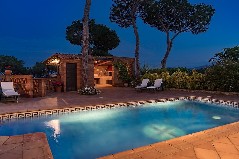 Casa PETIT CASTELL cieszy Konstrukcja: segment rundę oraz w stylu małego zamku / Castell. Widok na prawdziwego „Castell de Palafolls” Na pewno podoba. Masz ze wszystkich pomieszczeń mieszkalnych i sypialnie z widokiem na morze, ogród i prywatny basen (8 x 3,80 m). Otoczony dużym tarasem z leżakami na basenie jest idealnym miejscem do opalania i orzeźwiający. Obok basenu znajduje się duży zadaszony zewnątrz kuchnia ze stołem i krzesłami i grillem. Na pewno będzie często grilla tutaj razem i cieszyć się wielkie letnie noce z rodziną i przyjaciółmi.