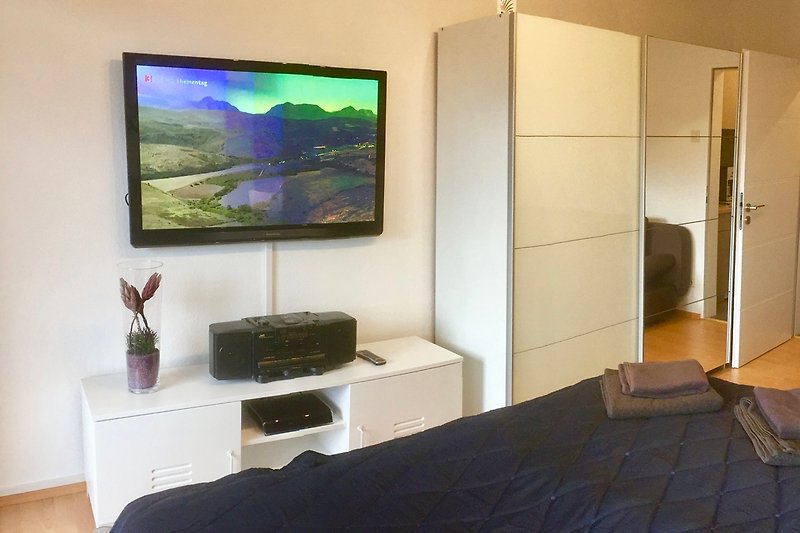Parter: (wejscie, salon(2-osobowa kanapa rozkładana, TV(flatscreen, satelita), zestaw wypoczynkowy, odtwarzacz DVD, radio, odtwarzacz CD, system stereo)