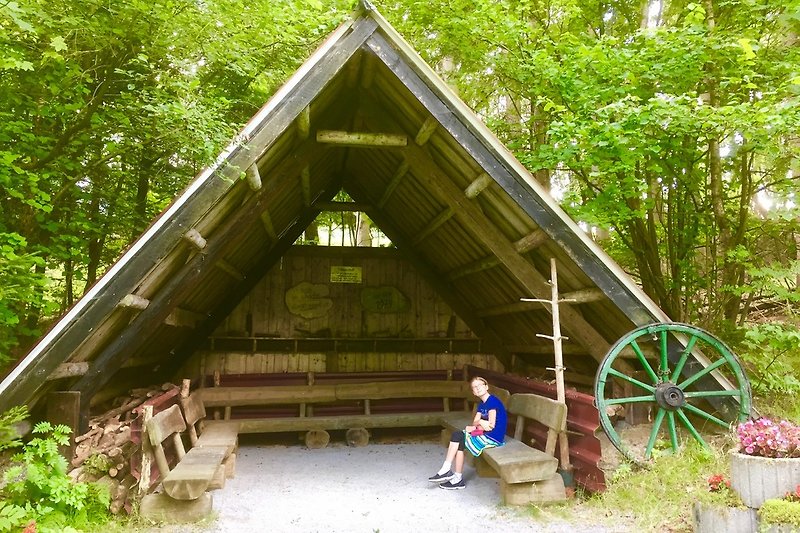 Nasza malinowa chatka została wybudowana jako drewniany domek dla maksymalnie czterech osób na dużym terenie przy lesie i wyposażona w przytulny i komfortowy sposób.
