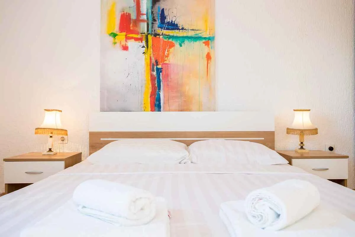 Wejście do Państwa apartamentu wakacyjnego znajduje się na 2. piętrze i prowadzi bezpośrednio do salonu z drzwiami do wszystkich pomieszczeń. Salon (20 m², pokój przechodni, nieogrzewany) z 1 dodatkowym miejscem do spania na kanapie/sofie, kącikiem wypoczynkowym, TV, jadalnią (5 miejsc) oraz wyjściem na balkon (meble ogrodowe, 1 stół, 5 krzeseł). Sypialnia (12 m², nieogrzewana) z 2 łóżkami pojedynczymi. Sypialnia (12 m², nieogrzewana) z 1 łóżkiem podwójnym. Kuchnia w salonie (pokój przechodni, nieogrzewana) z kuchenką gazową, kuchenką elektryczną (2 palniki), lodówką (z zamrażalnikiem), ekspresem do kawy oraz wyjściem na balkon. Łazienka (5 m²) z wanną, 1 umywalką, WC i oknem.
