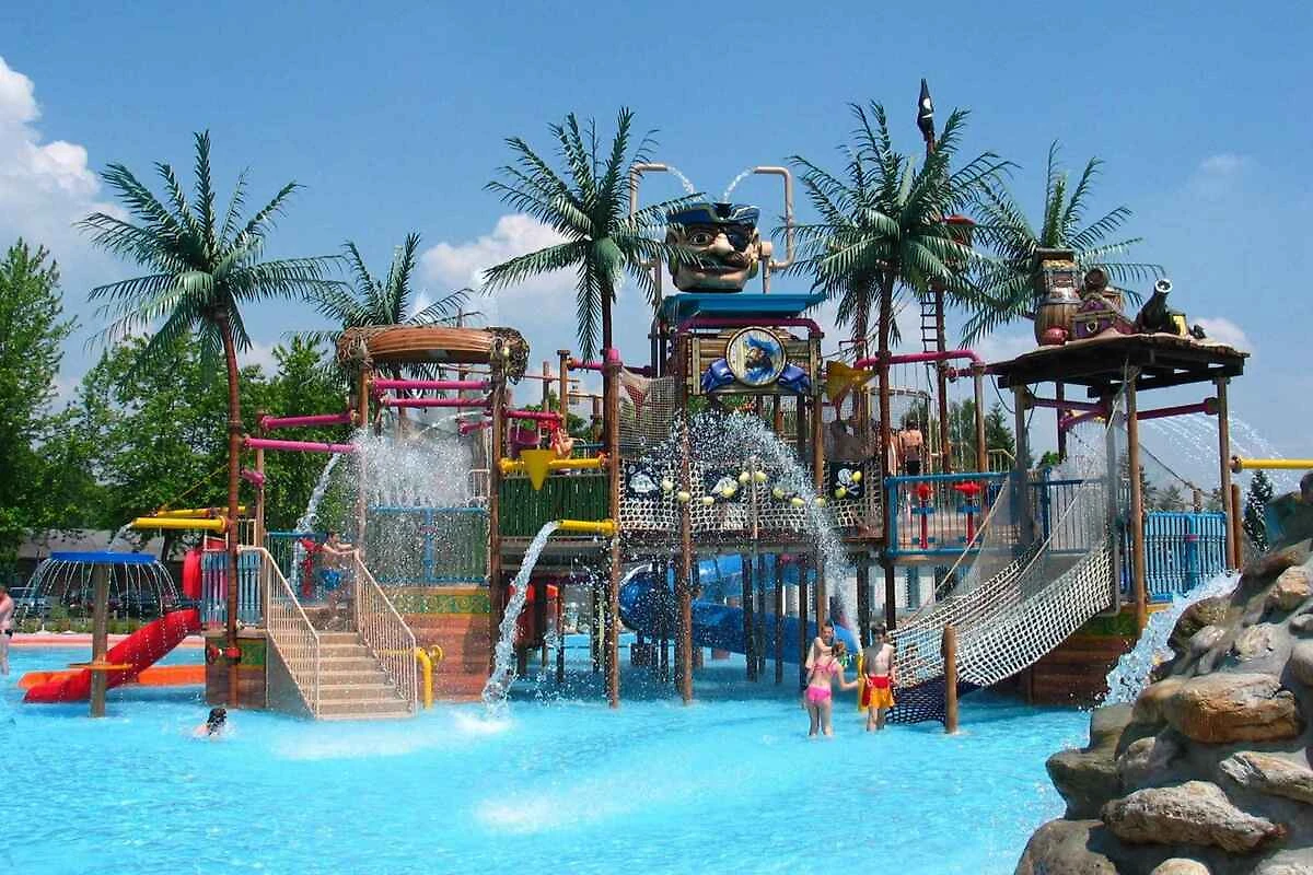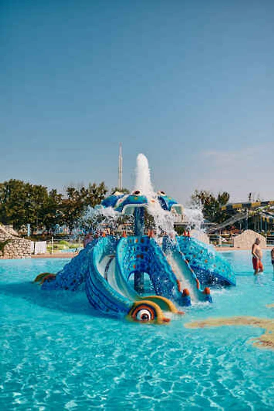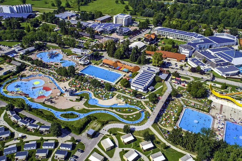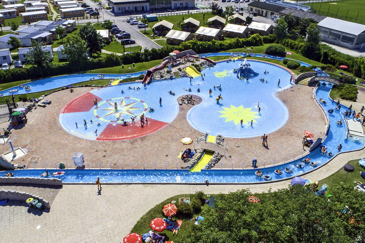 Wszystkie baseny są dostępne do wspólnego użytku. Basen zewnętrzny. Basen dla dzieci. Basen kryty. Wioska oferuje dwa oddzielne parki termalne, aby zapewnić rozrywkę przez cały rok. Letnia Termalna Riwiera rozciąga się na powierzchni 10 000 m² wód termalnych i oferuje różnorodne baseny w różnych kształtach i rozmiarach, odpowiednie zarówno dla dorosłych, jak i dla dzieci. Główne atrakcje to zjeżdżalnie wodne, wyspa piratów, kanał z prądem, basen z falami i jacuzzi, idealne do relaksu na słońcu. Zimowa Termalna Riwiera, z 2 300 m² podgrzewanej wody termalnej, jest idealna na całoroczne pobyty wellness i oferuje baseny wewnętrzne i zewnętrzne, zjeżdżalnie wodne i inne atrakcje dla dużych i małych.