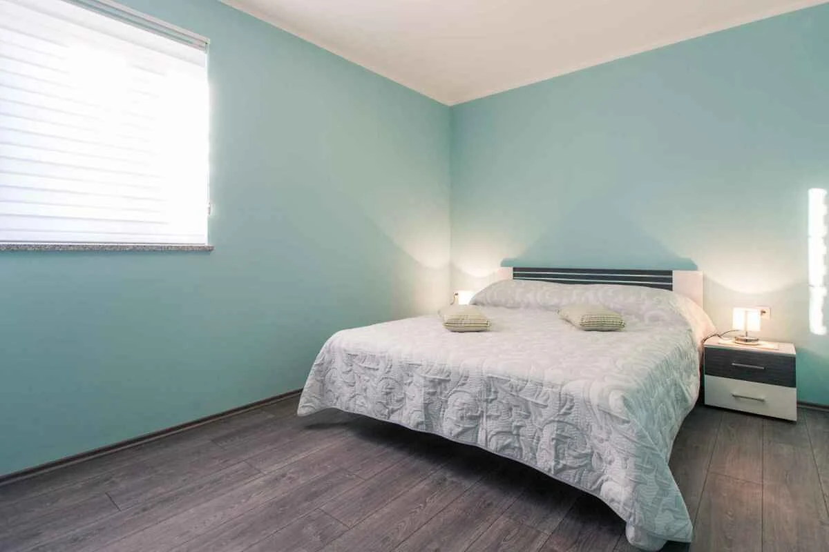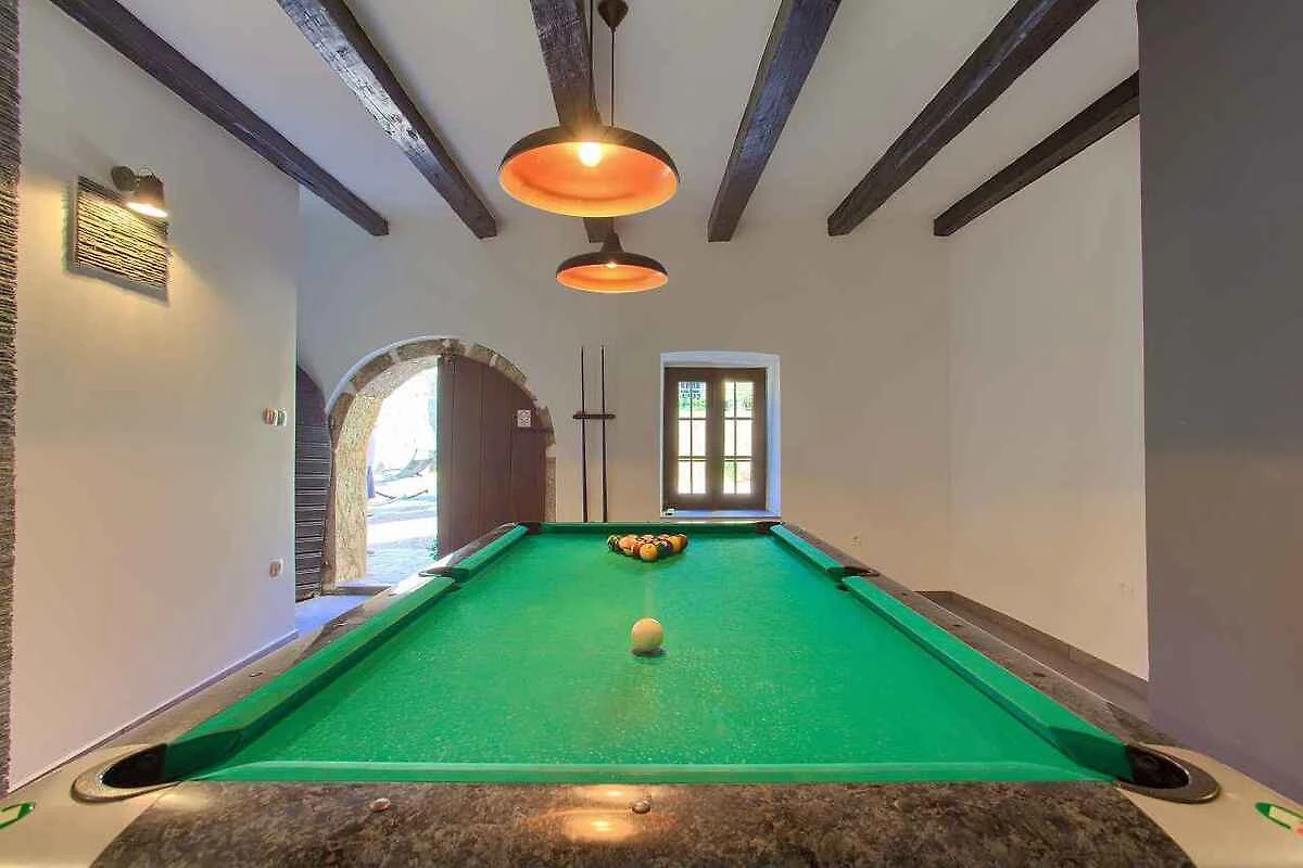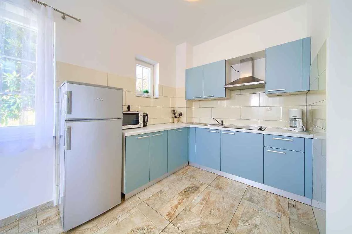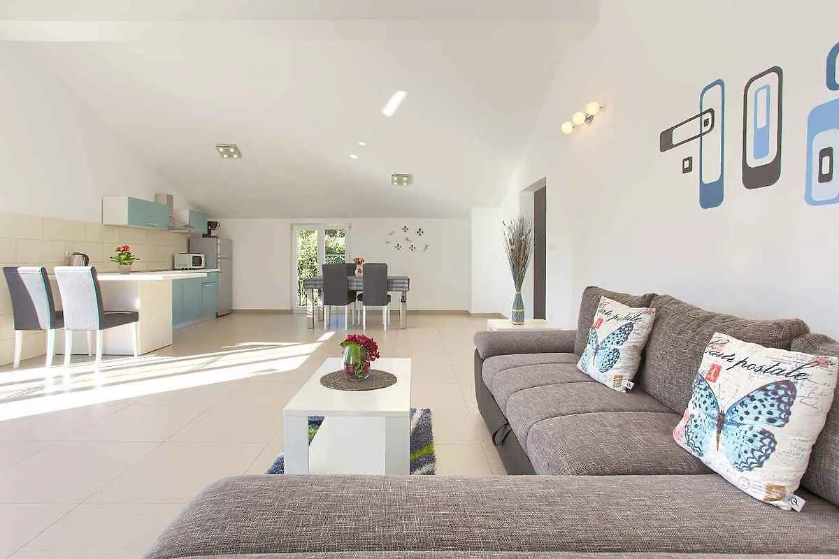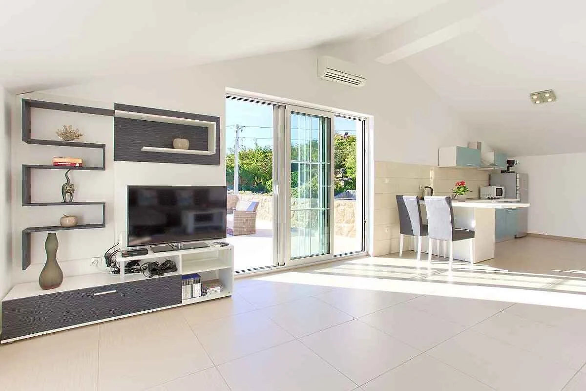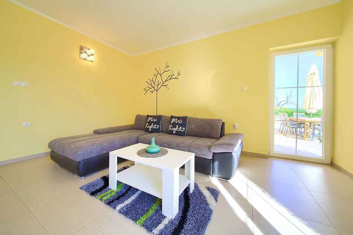 Krk. Willa znajduje się na ogrodzonej działce o powierzchni 800 m² z kwiatami i drzewami, otoczona płotem. Właściciel nie mieszka w domu ani na posesji. Dojazd odbywa się drogą boczną (asfaltowaną). Parking na terenie posesji.