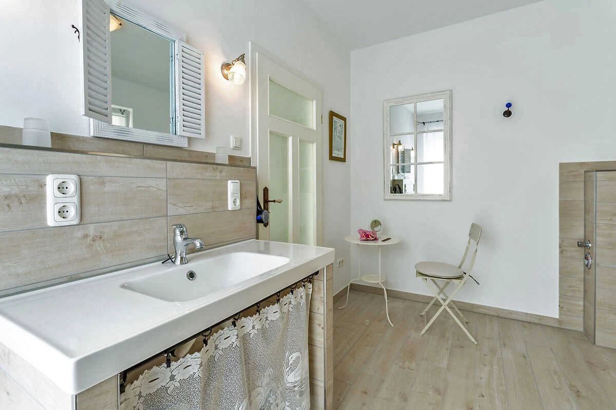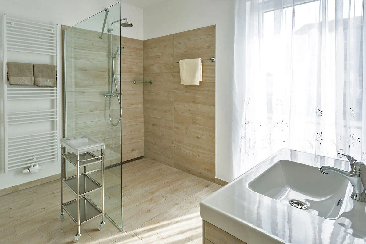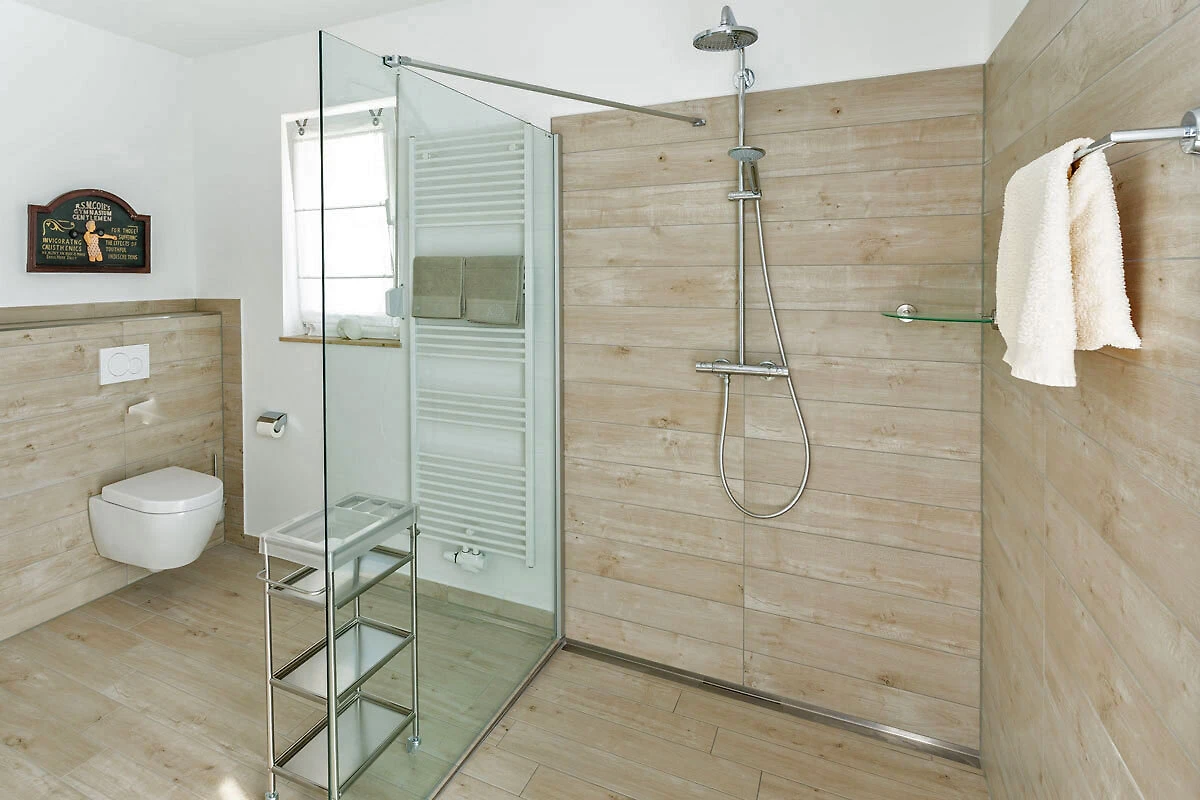 Łazienka z WC oferuje przestronną strefę prysznicową o wymiarach 140cm x 140cm na poziomie gruntu oraz miejsce do siedzenia, które umożliwia wygodną pielęgnację ciała. Lustro do makijażu, suszarka do włosów i konik na ubrania są zapewnione. Okno wychodzi na wschód, a duże drzwi tarasowe na południe.