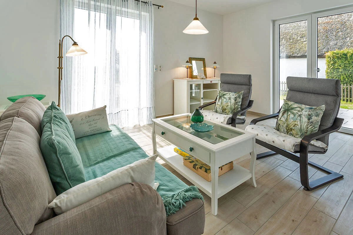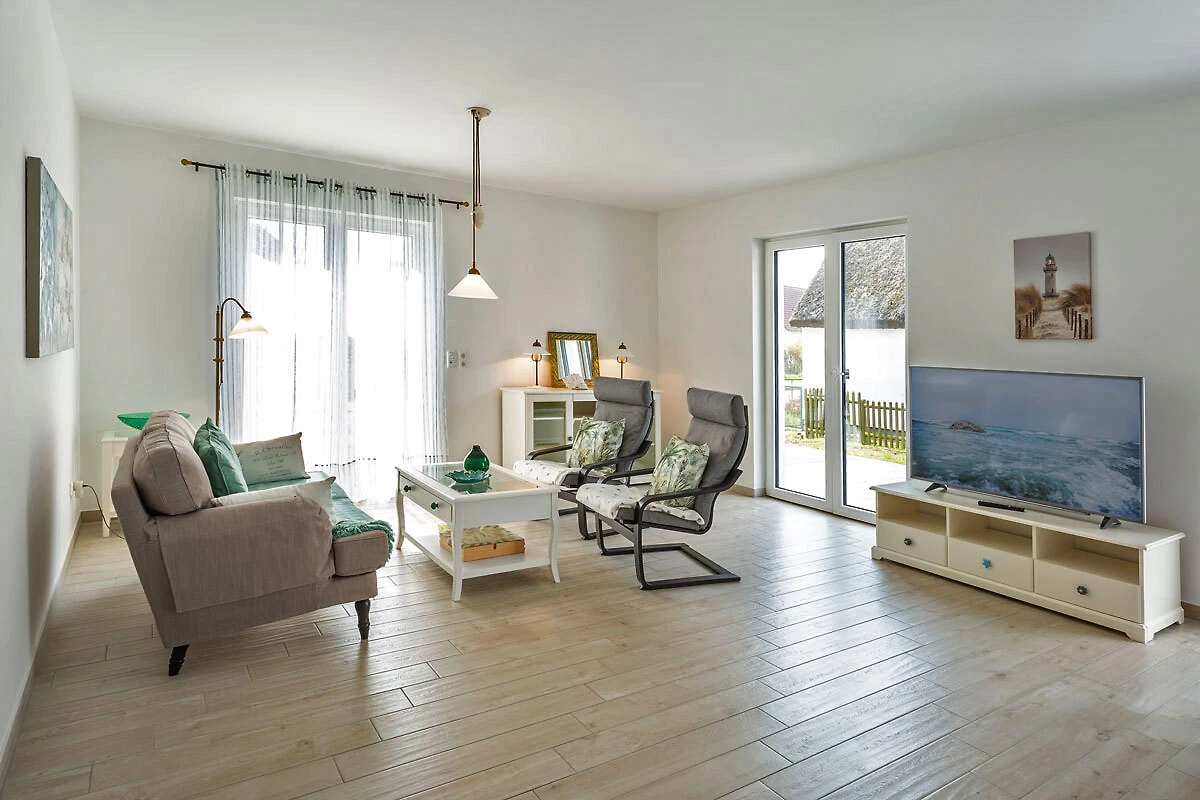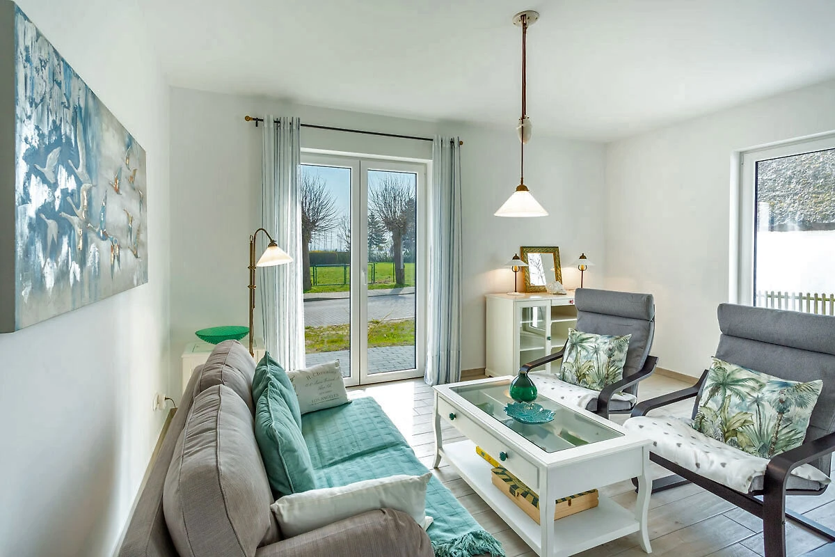 Ciesz się beztroskim urlopem z dużą ilością światła, dużą ilością powietrza, dużą ilością słońca. Czeka na Ciebie obszerny salon i jadalnia (33,74 m²) z trzema dużymi drzwiami tarasowymi wychodzącymi na południe i zachód. Wygodna kanapa i dwa fotele zapraszają do relaksu, oglądania telewizji (TV/Sat, 55-calowy płaski ekran/ Smart-TV), surfowania po internecie (darmowa sieć WLAN ) lub zabawy w gry (dostępne gry planszowe). W dużej, 5-metrowej, w pełni wyposażonej kuchni (z bezpośrednim i pośrednim oświetleniem) znajduje się 4-płytowa kuchenka (Ceran), piekarnik, lodówka, zamrażarka, zmywarka i inne różne urządzenia elektryczne, takie jak ekspres do kawy, czajnik, toster, bojler do jajek.