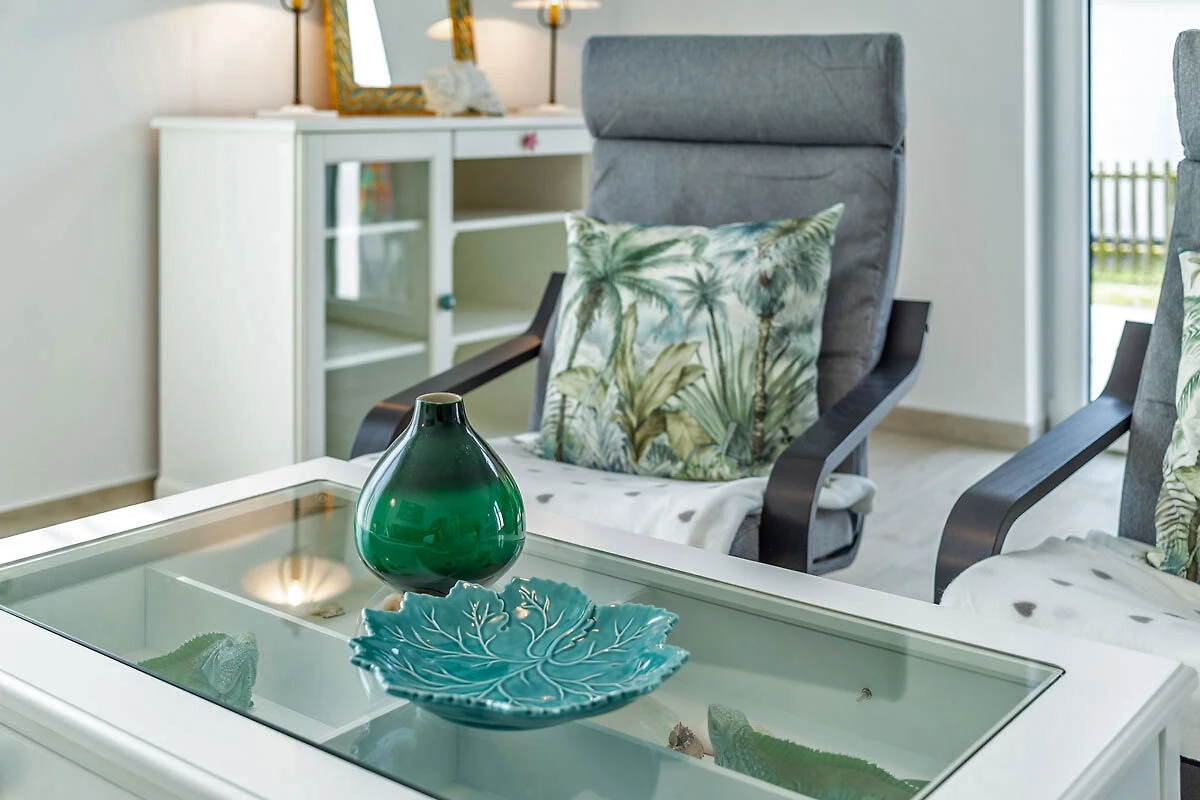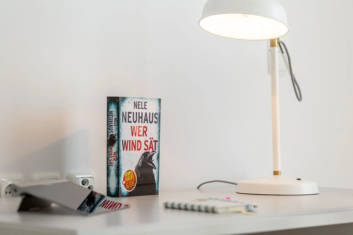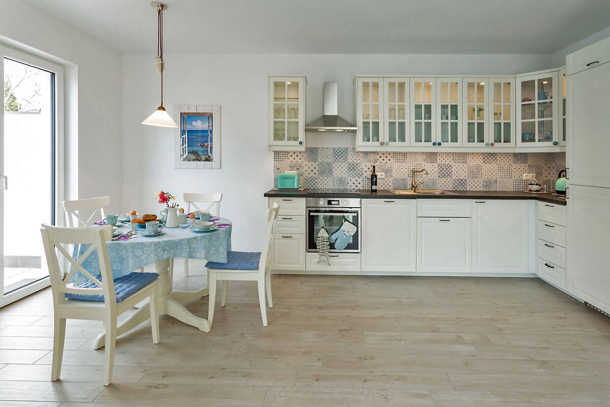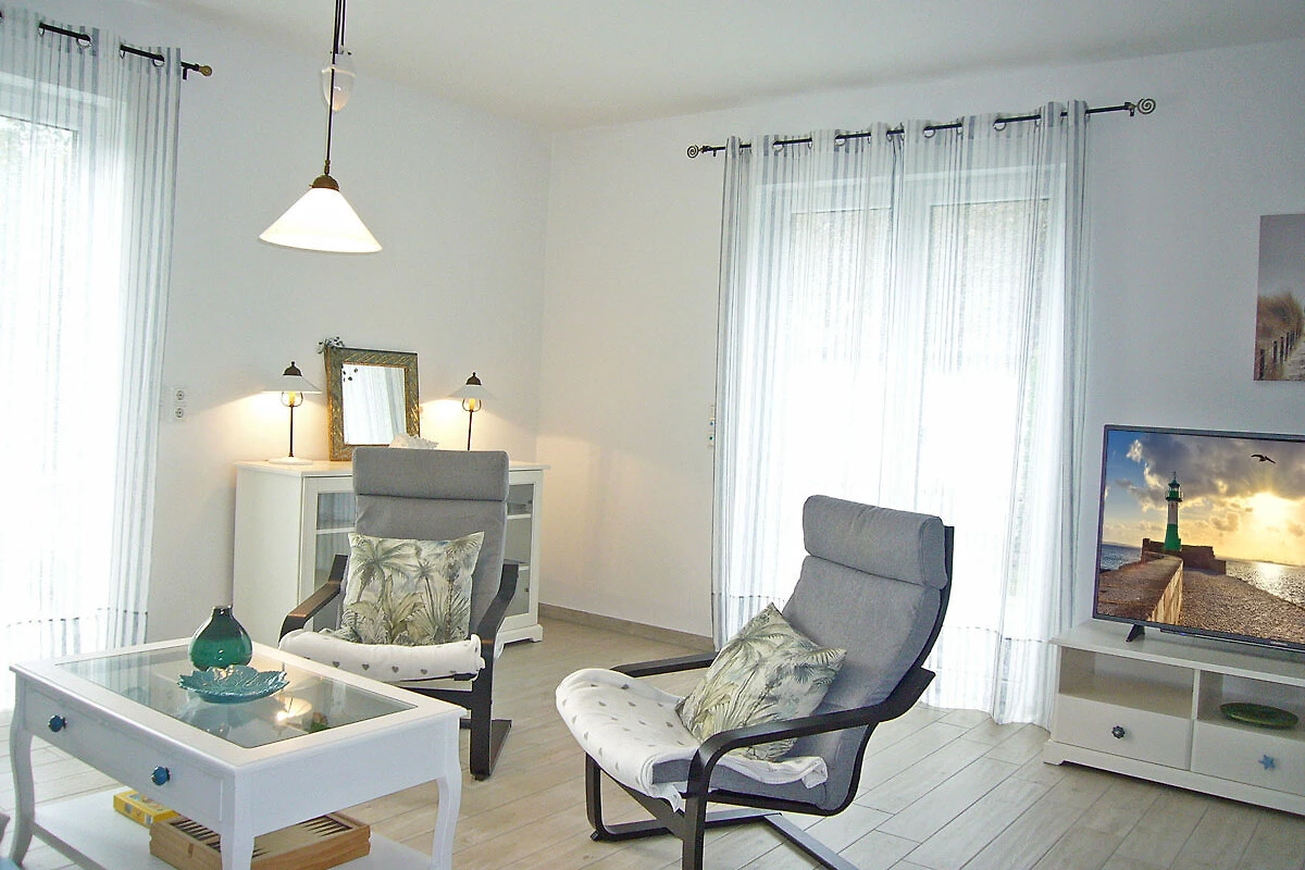 Ciesz się beztroskim urlopem z dużą ilością światła, dużą ilością powietrza, dużą ilością słońca. Czeka na Ciebie obszerny salon i jadalnia (33,74 m²) z trzema dużymi drzwiami tarasowymi wychodzącymi na południe i zachód. Wygodna kanapa i dwa fotele zapraszają do relaksu, oglądania telewizji (TV/Sat, 55-calowy płaski ekran/ Smart-TV), surfowania po internecie (darmowa sieć WLAN ) lub zabawy w gry (dostępne gry planszowe). W dużej, 5-metrowej, w pełni wyposażonej kuchni (z bezpośrednim i pośrednim oświetleniem) znajduje się 4-płytowa kuchenka (Ceran), piekarnik, lodówka, zamrażarka, zmywarka i inne różne urządzenia elektryczne, takie jak ekspres do kawy, czajnik, toster, bojler do jajek.