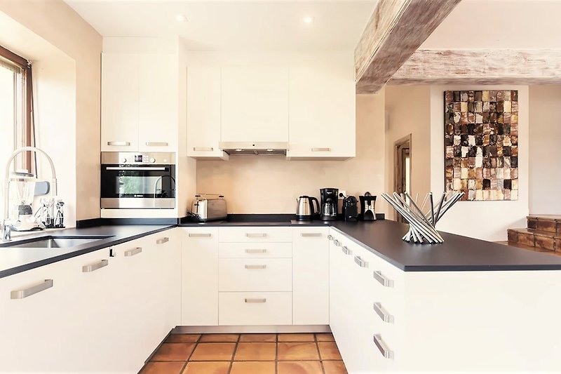 Nowy nowoczesna kuchnia jest w pełni wyposażona. (Lodówka, zamrażarka, zmywarka, mikrofalówka, piekarnik, z rusztu, urządzenia kuchenne, ekspres do kawy Nespresso, żelazko / deska, itp)
