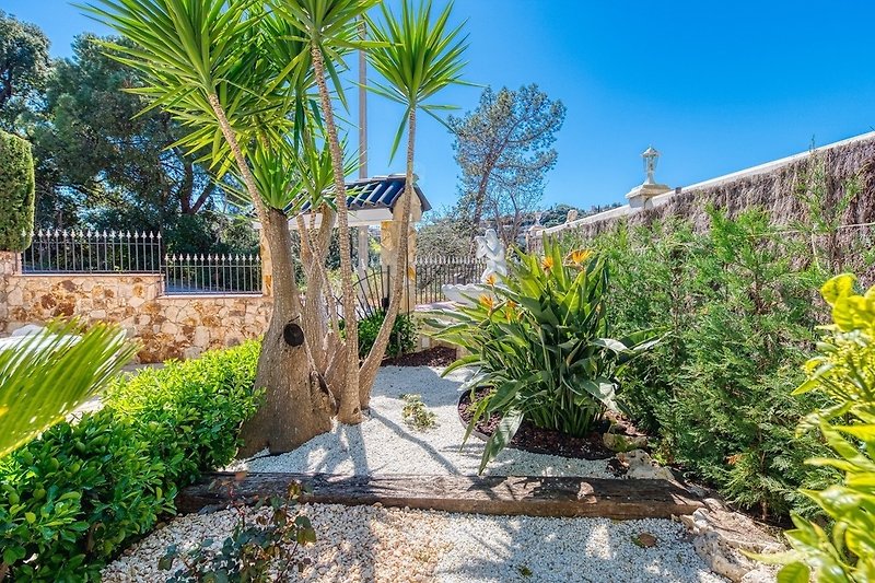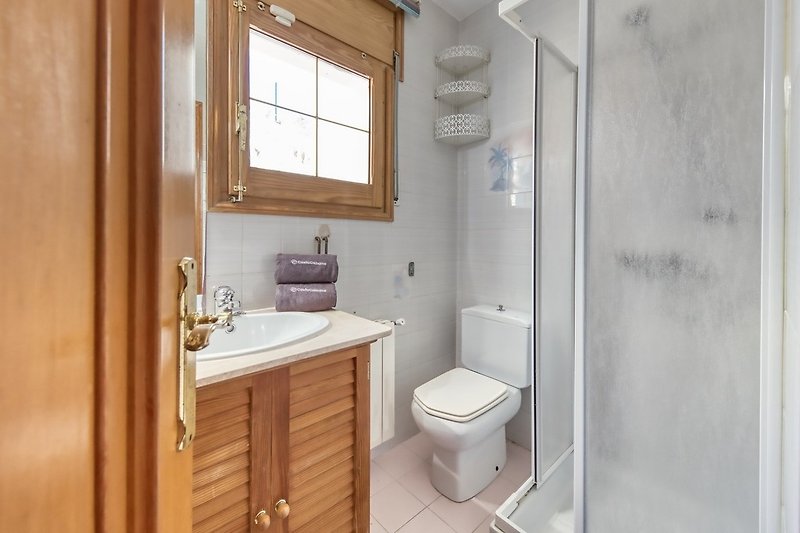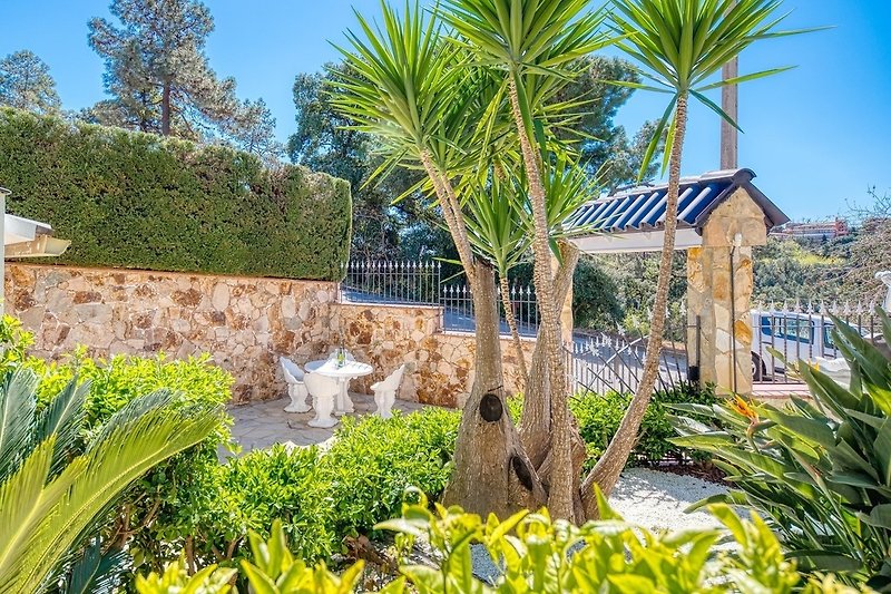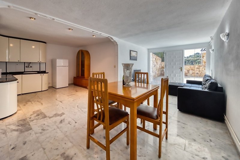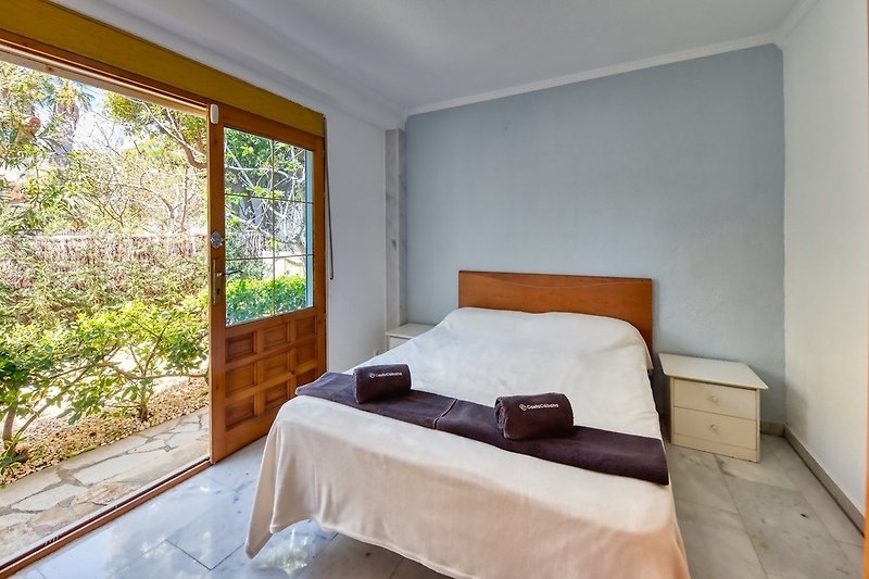 Przy wejściu jest wystarczająco dużo miejsca, aby zaparkować samochód na własnej posesji. W sąsiedztwie znajduje się część apartamentowa willi. Jeśli masz dzieci i / lub chciałbyś mieć własny pokój, jest to bardzo dobrze możliwe w tym miejscu. Ta oddzielna część składa się z salonu z kuchnią. Można iść po schodach od góry do dołu, jest to również możliwe z zewnątrz.