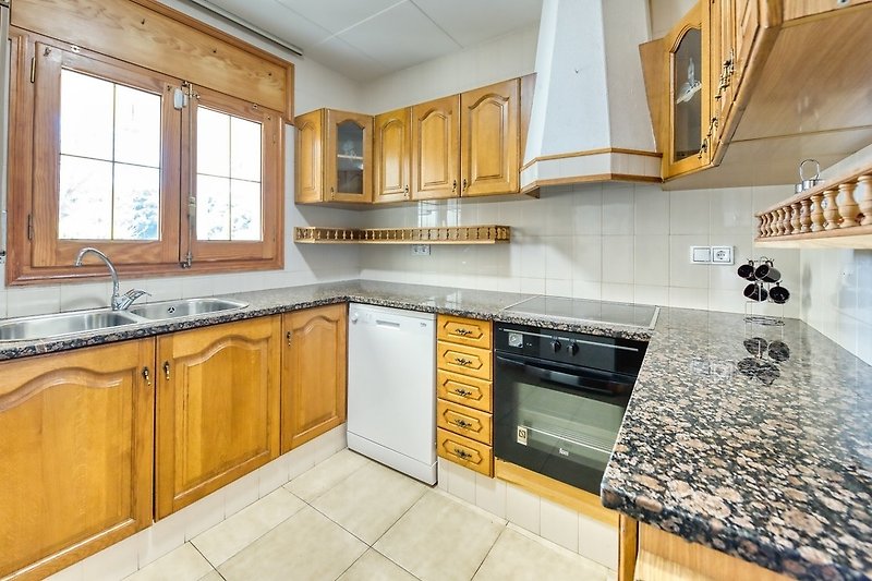 Wewnątrz znajduje się przestronna kuchnia, 4 sypialnie, 3 z drzwiami na zewnątrz i 2 łazienki. Z tyłu willi znajduje się osobne pomieszczenie z pralką.