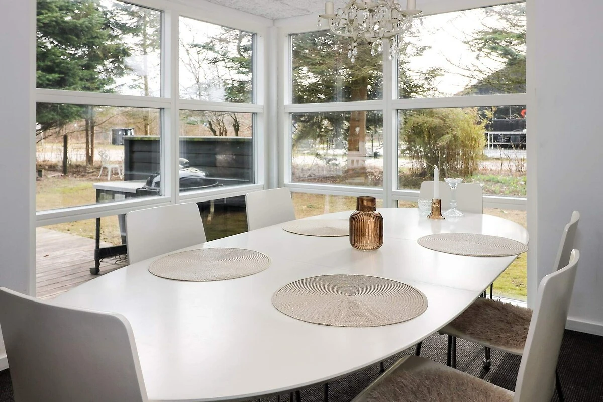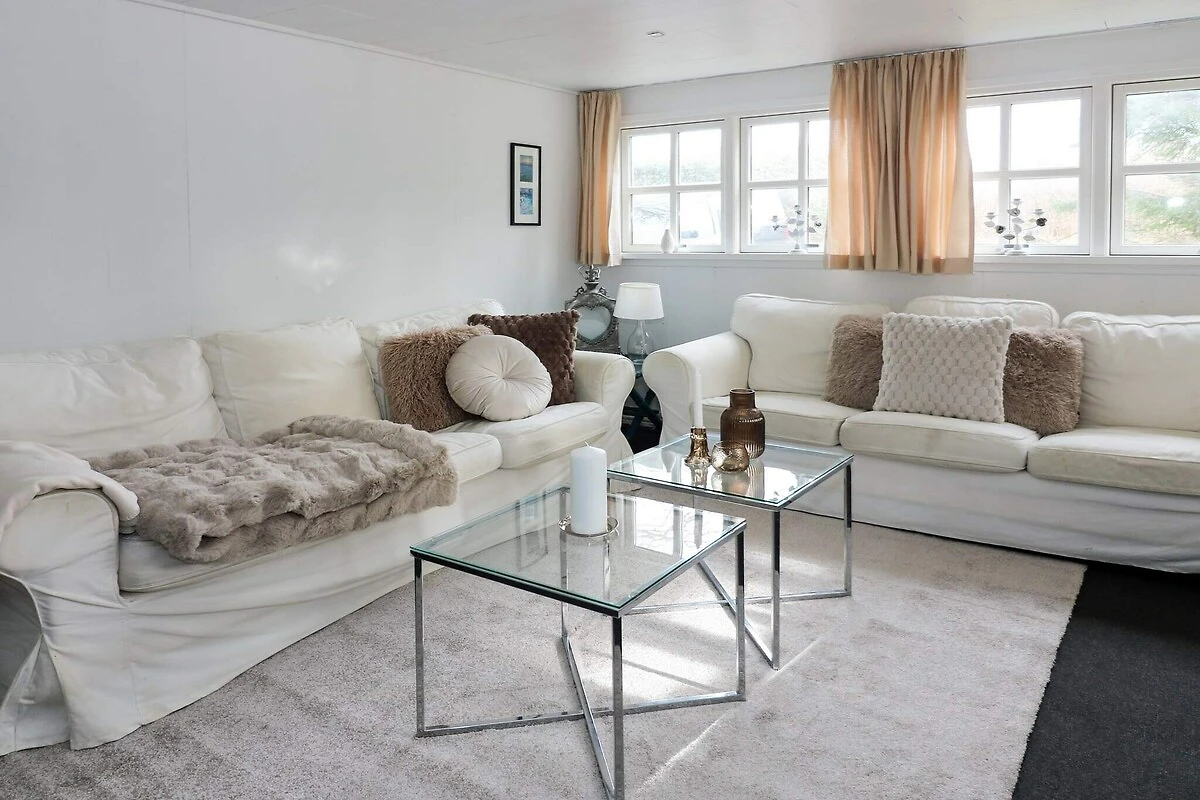 Otwarta kuchnia(kuchenka(elektryczny), zaparzacz do kawy, lodówka(+ zamrazarka), pralka), salon/sypialnia(TV(Duńskie programy TV), krzesło dziecięce), sypialnia(łóżko 2-osobowe), sypialnia(2x łóżko 1-osobowe), łazienka(podlogowe)(wanna lub prysznic, umywalka, toaleta), ogrzewanie(elektryczne), taras, taras(zadaszony), Pompa ciepła typu powietrze-powietrze