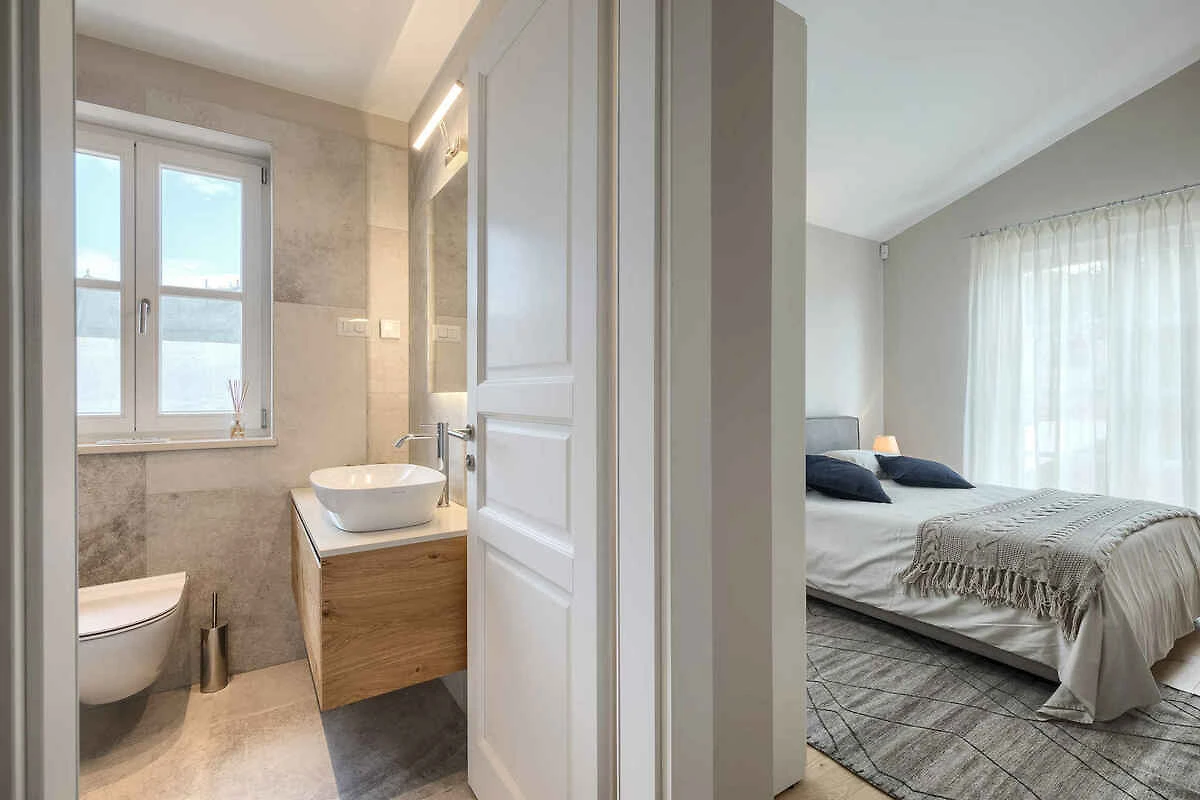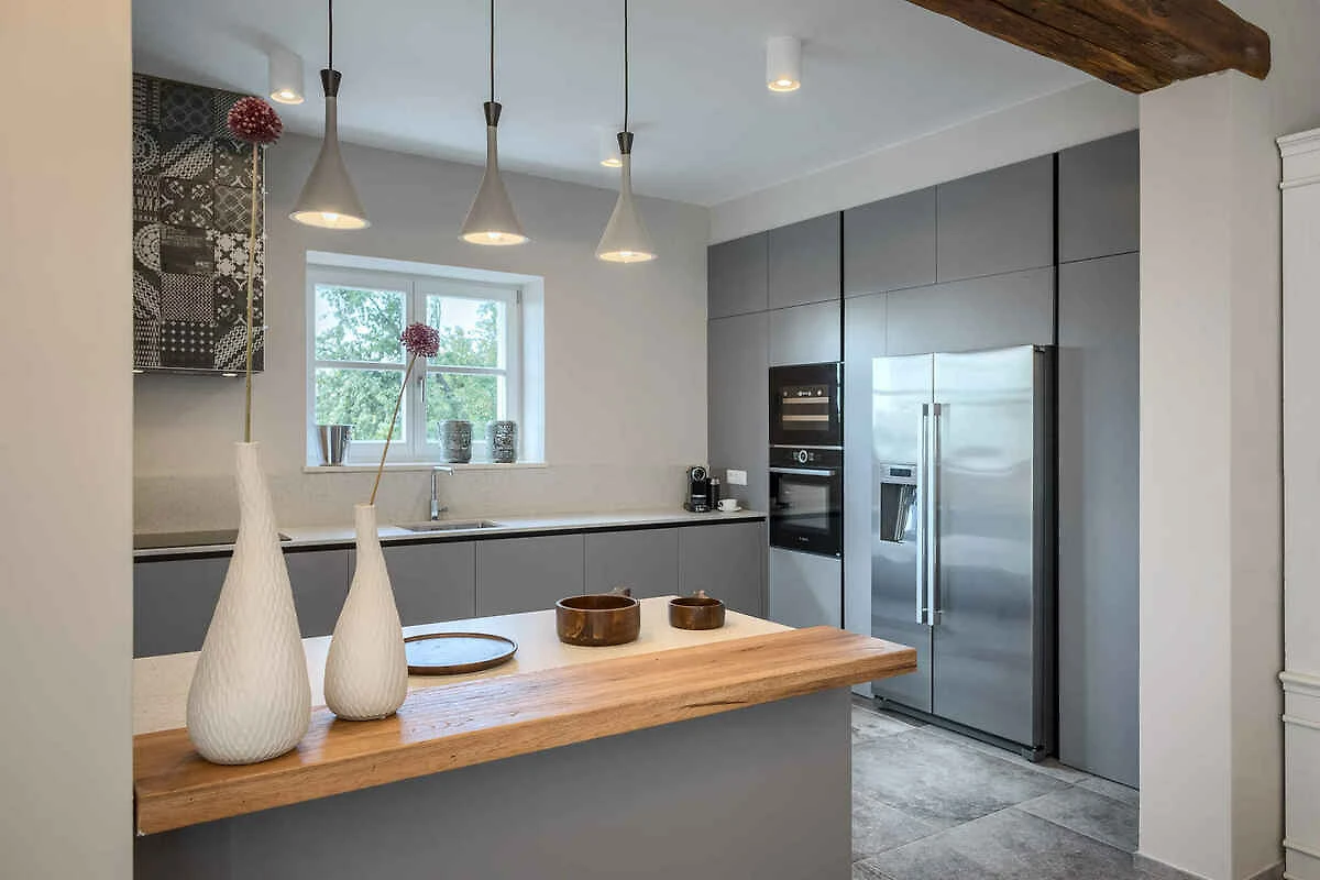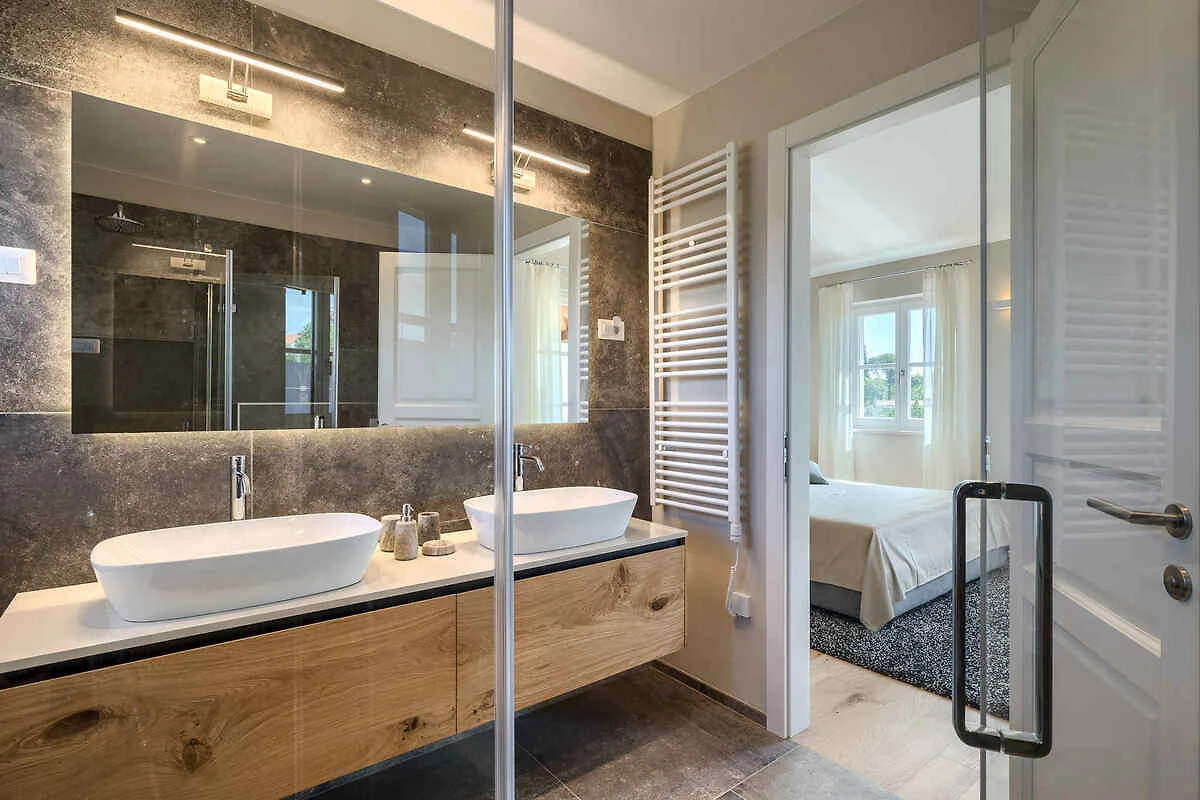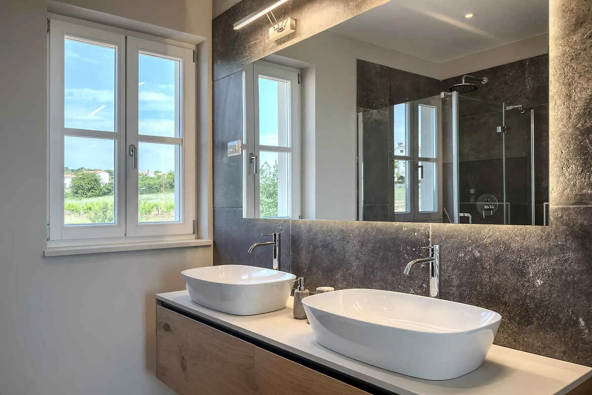 Višnjan. Willa znajduje się na ogrodzonej działce ogrodowej o powierzchni 870 m² z trawnikiem, kwiatami, krzewami i drzewami, ograniczonej płotem i żywopłotem. Właściciel nie mieszka w domu ani na posesji. Nasza willa z pięknym widokiem na morze jest idealnym miejscem na relaks w pięknym krajobrazie Istrii. Nowa, jasna, nowocześnie urządzona willa z 2 przestronnymi tarasami oraz pięknym ogrodem z basenem oferuje miejsce dla 8 osób. Willa została zbudowana w śródziemnomorskim, regionalnym stylu. Położenie miejscowości Višnjan na zapleczu romantycznych miast Poreč i Novigrad jest oczywiście jedną z głównych zalet tej lokalizacji. Miasta Poreč i Novigrad znajdują się 10–15 minut jazdy samochodem od Višnjan. Višnjan to sielankowa miejscowość w Istrii, która nie jest zatłoczona przez turystów. Miejscowość charakteryzuje się głównie zabudową typową dla regionu. Dojazd odbywa się drogą boczną (asfaltowaną). Parking (dla 2 samochodów) w zadaszonym miejscu postojowym oraz na ulicy przed domem.