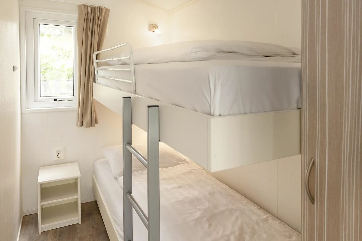 Ten dobrze wyposażony domek posiada dwie sypialnie – jedną z łóżkiem podwójnym (lub dwoma pojedynczymi) i drugą z łóżkiem piętrowym – oferując idealny pobyt dla rodzin lub przyjaciół. Otwarta kuchnia wyposażona jest w lodówko-zamrażarkę, czajnik, ekspres do kawy i niezbędne udogodnienia, które ułatwią przygotowanie domowych posiłków. Wyjdź na słoneczny taras z meblami ogrodowymi, idealny na śniadania na świeżym powietrzu lub wieczorne drinki. Wspólny kryty basen zapewni dodatkową zabawę bez względu na pogodę.