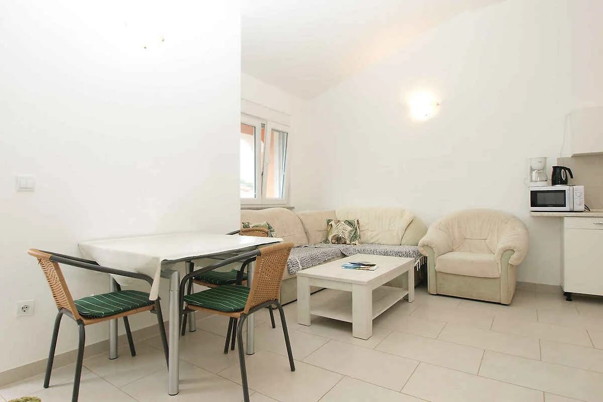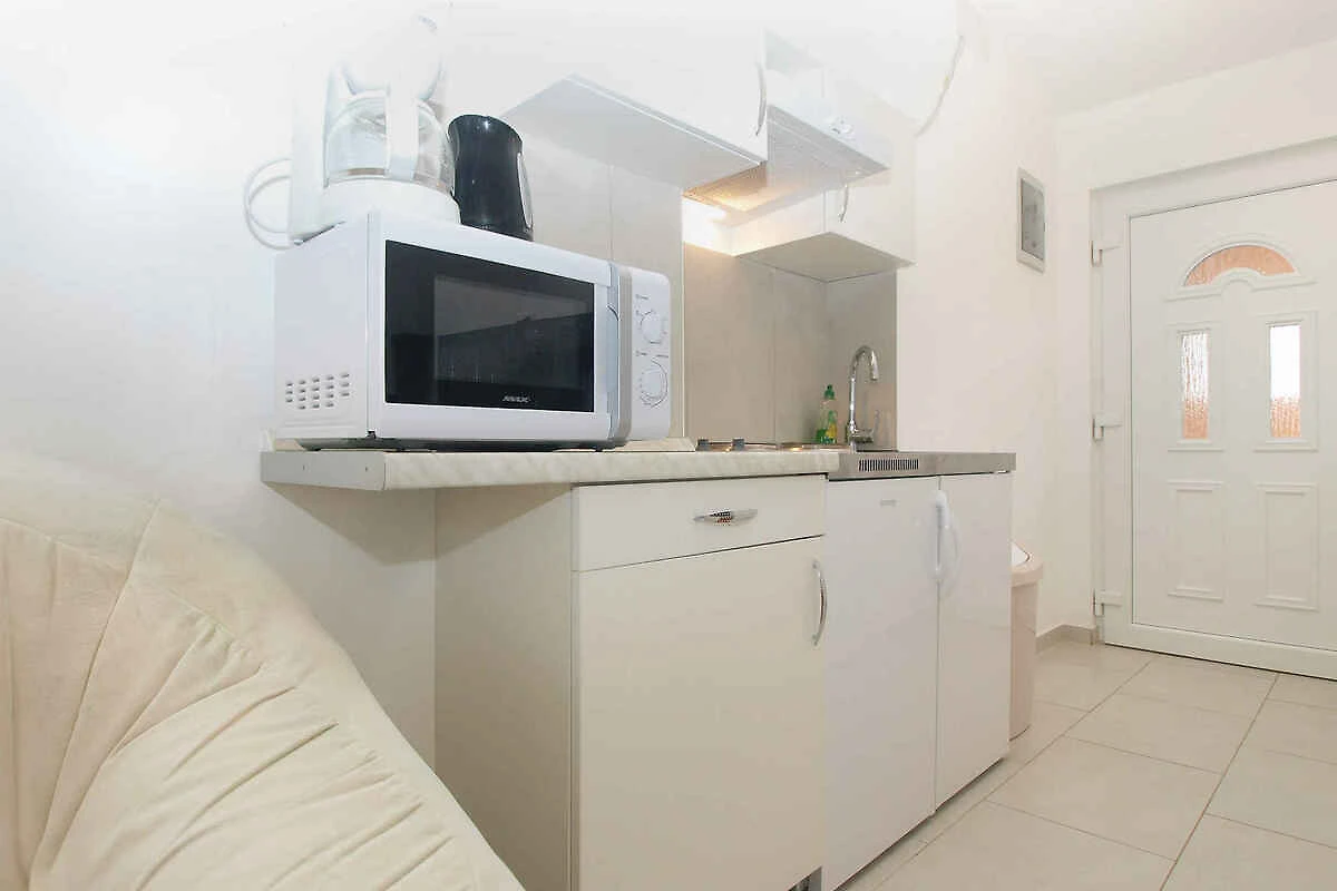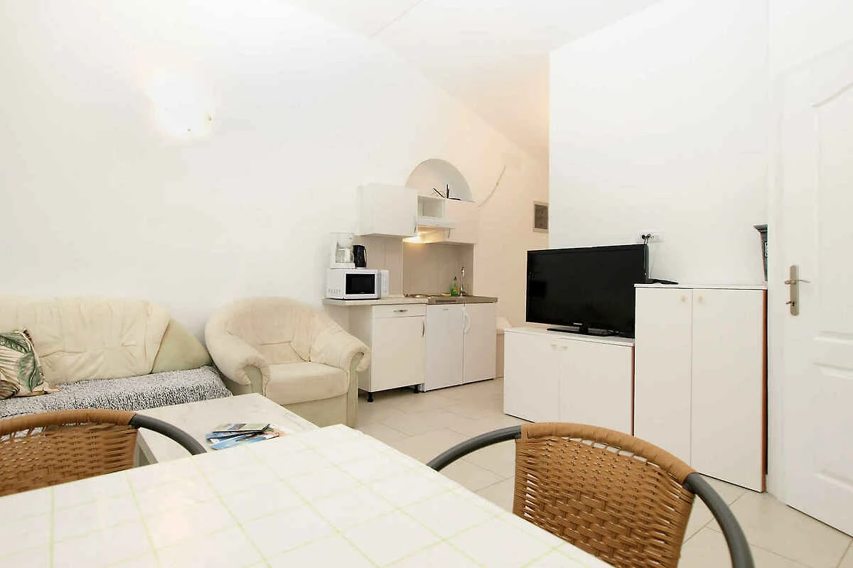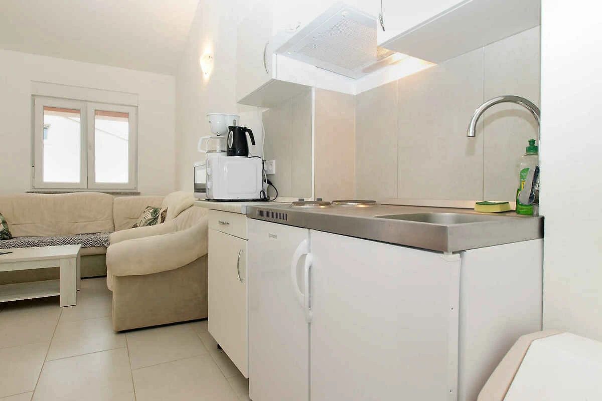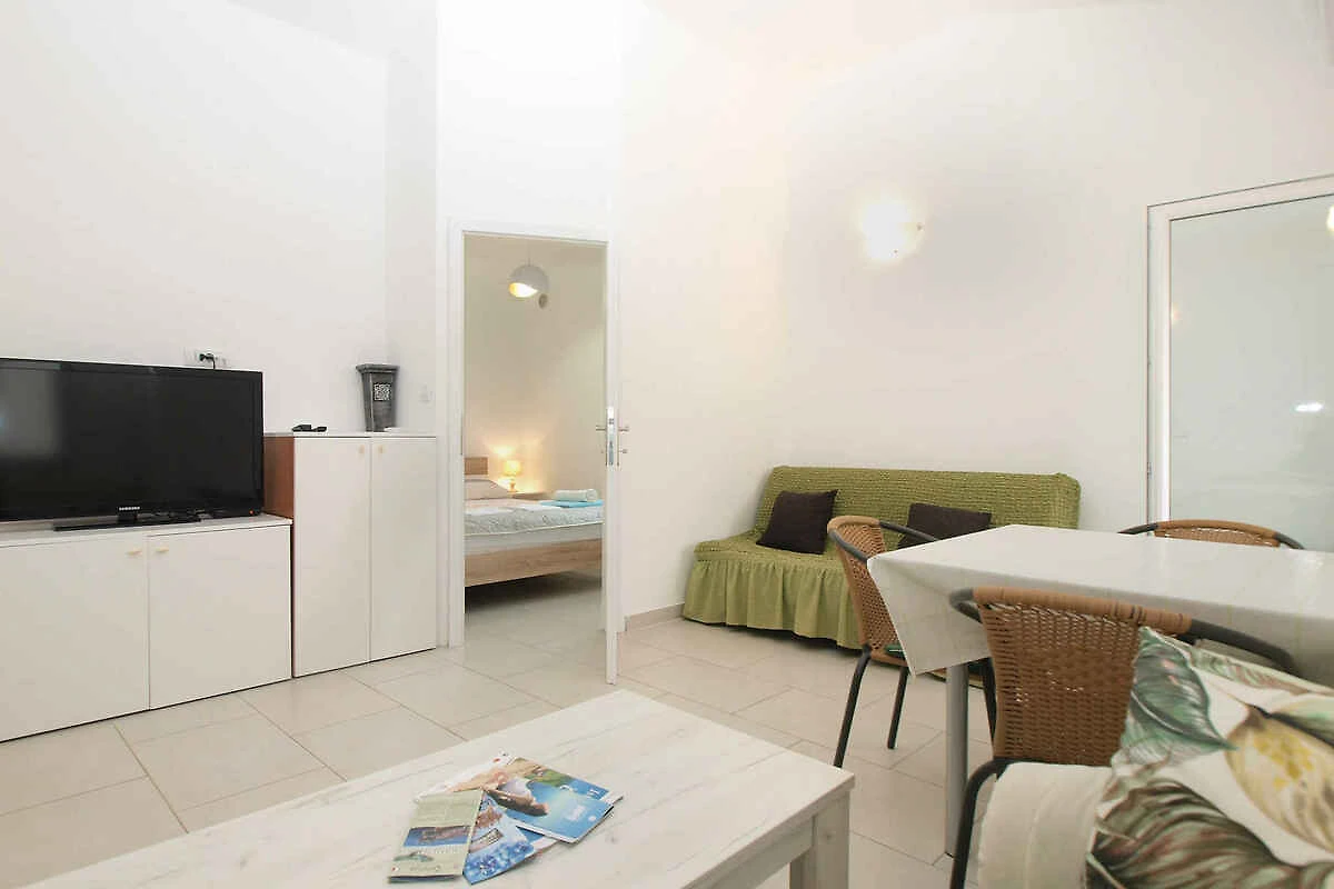 Wejście do Państwa apartamentu wakacyjnego znajduje się na wysokim parterze, jest bezprogowe i prowadzi bezpośrednio do kuchni. Kuchnia z salonem (pokój przechodni) z 1 dodatkowym miejscem do spania na kanapie/sofie, kącikiem wypoczynkowym, TV, klimatyzacją i jadalnią. Sypialnia z 1 łóżkiem podwójnym i klimatyzacją. Aneks kuchenny w kuchni z salonem (pokój przechodni) z klimatyzacją, kuchenką elektryczną (2 palniki), lodówką, kuchenką mikrofalową, ekspresem do kawy i elektrycznym czajnikiem. Łazienka z prysznicem, 1 umywalką i WC.