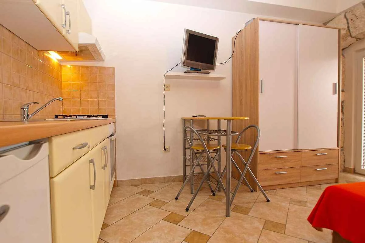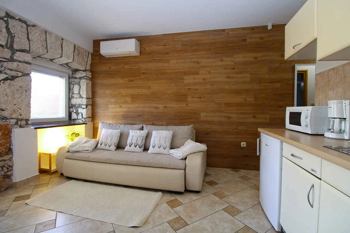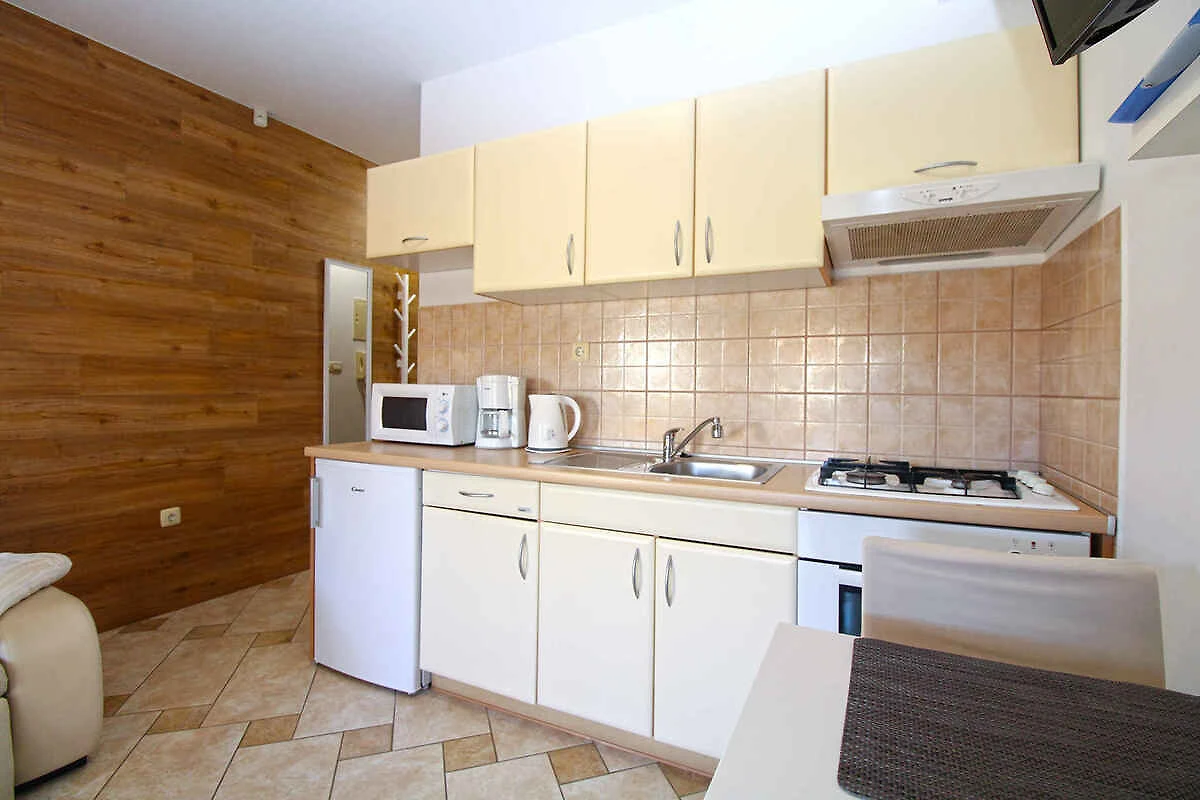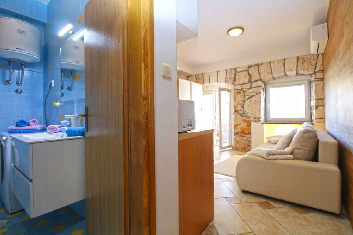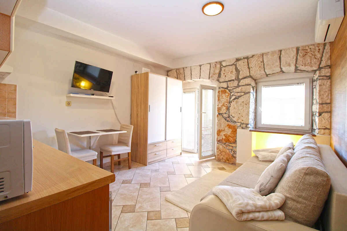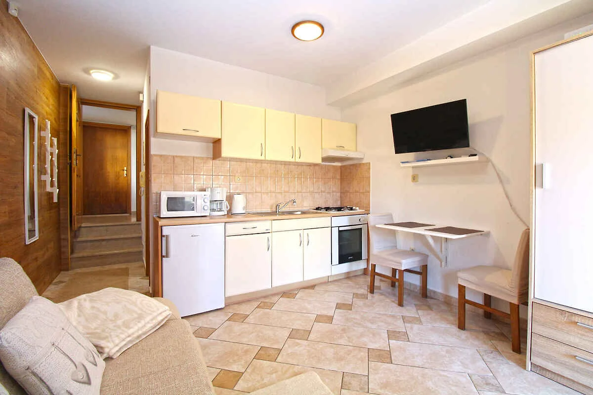 Wejście do Państwa studia znajduje się na parterze. Pokój dzienny/sypialnia (12 m²) z 1 łóżkiem podwójnym, TV, klimatyzacją, częścią jadalną (2 miejsca) oraz wyjściem na taras (8 m², zadaszony, meble ogrodowe). Aneks kuchenny w pokoju dziennym/sypialni z klimatyzacją, kuchenką gazową, piekarnikiem, okapem, lodówką (zamrażalnik), kuchenką mikrofalową, ekspresem do kawy, czajnikiem elektrycznym oraz wyjściem na taras. Łazienka (4 m²) z pralką, prysznicem, 1 umywalką, WC i bidetem.