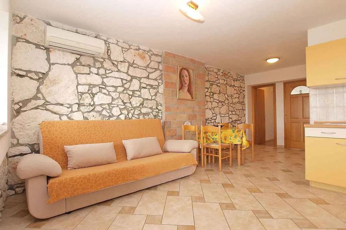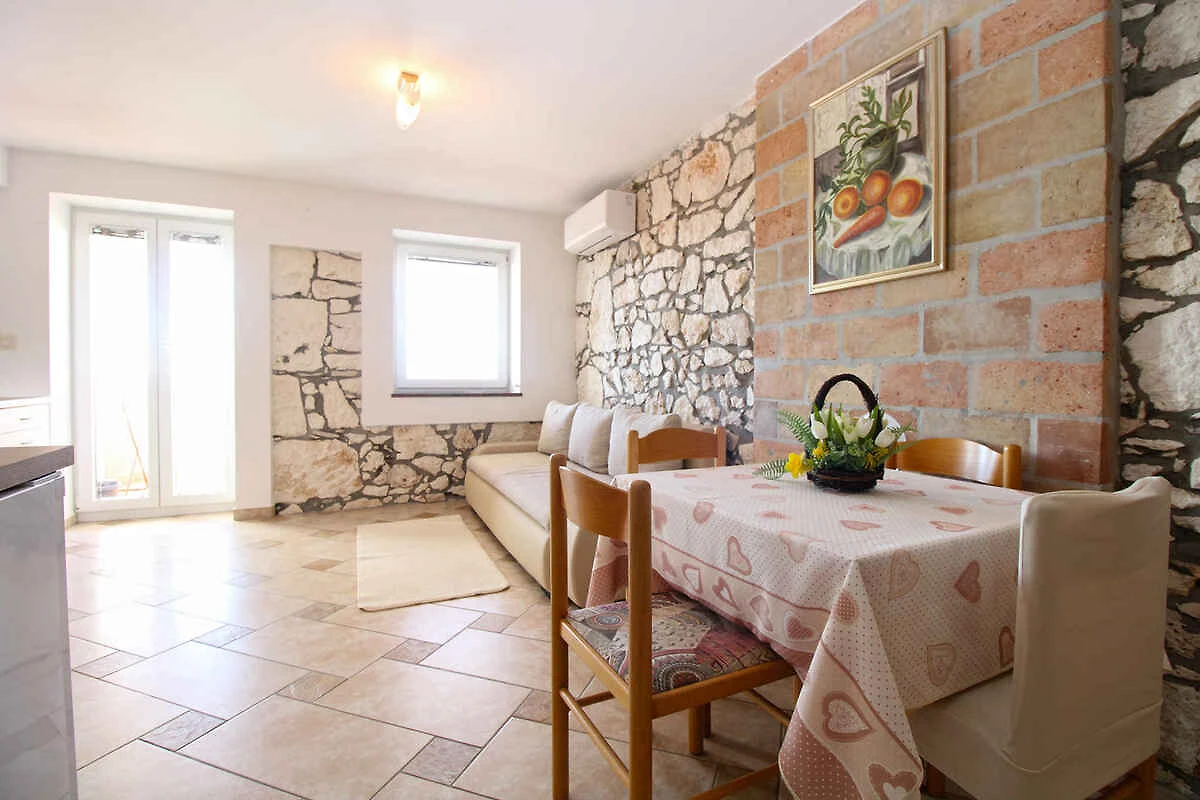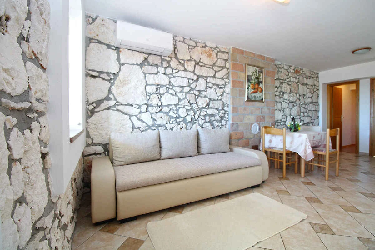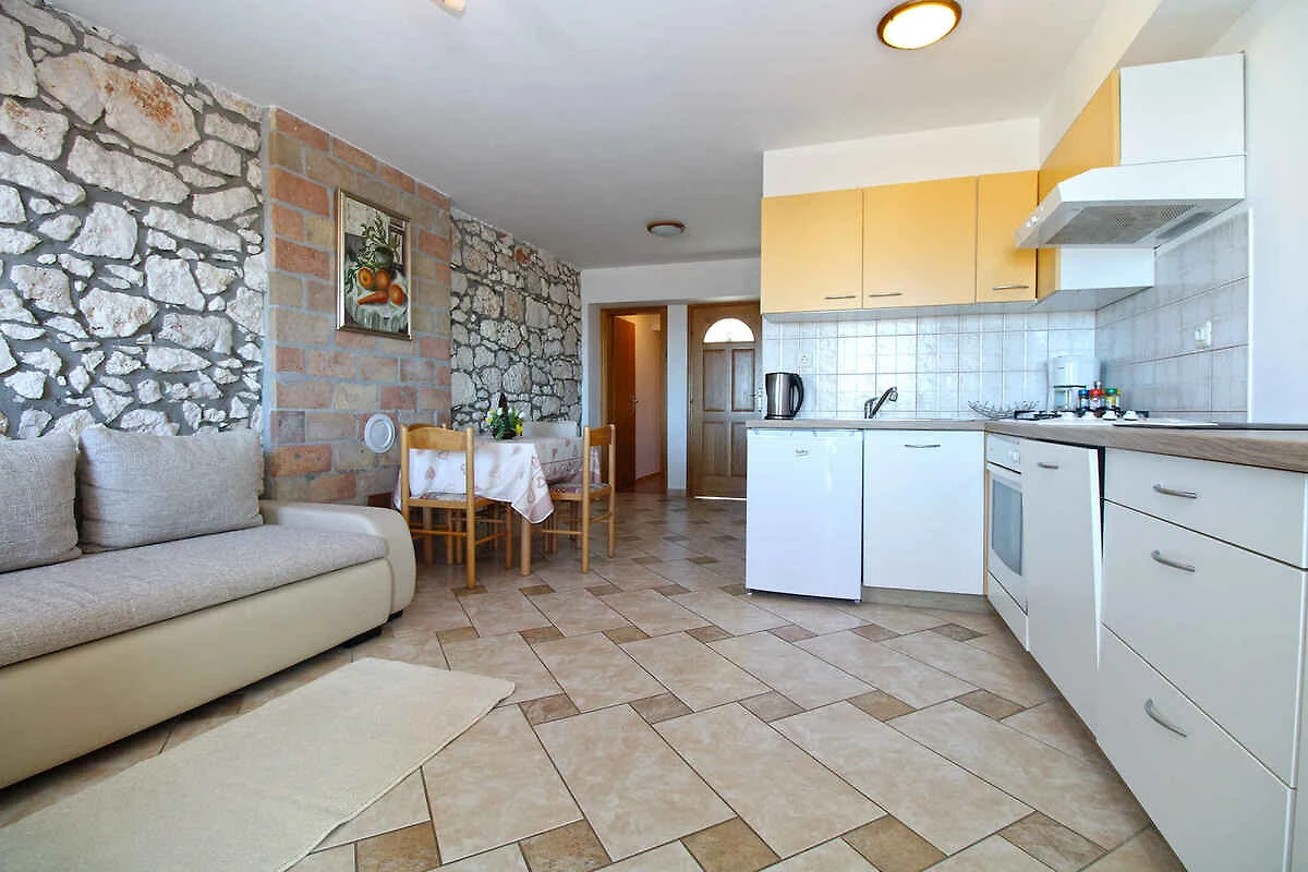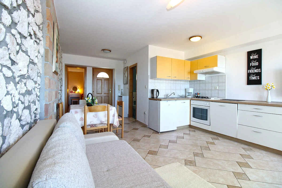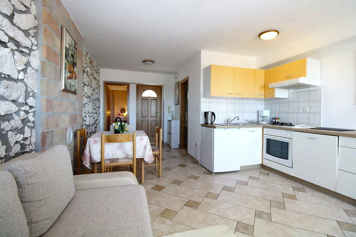 i prowadzi wewnętrznymi schodami bezpośrednio do salonu. Salon (20 m²) z 2 dodatkowymi miejscami do spania na kanapie/sofie, kącikiem wypoczynkowym, TV, klimatyzacją, jadalnią (4 miejsca) oraz wyjściem na balkon (8 m², zadaszony, meble ogrodowe). Sypialnia (10 m²) z 1 łóżkiem podwójnym. Aneks kuchenny w salonie z klimatyzacją, kuchenką gazową, piekarnikiem, okapem, lodówką (z zamrażalnikiem), kuchenką mikrofalową, ekspresem do kawy, czajnikiem elektrycznym oraz wyjściem na balkon. Łazienka (4 m²) z pralką, prysznicem, 1 umywalką i WC.