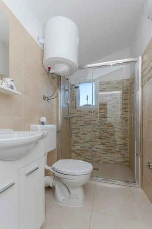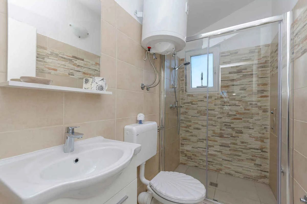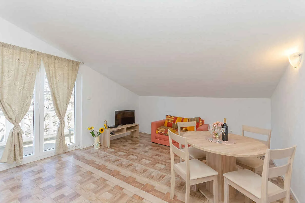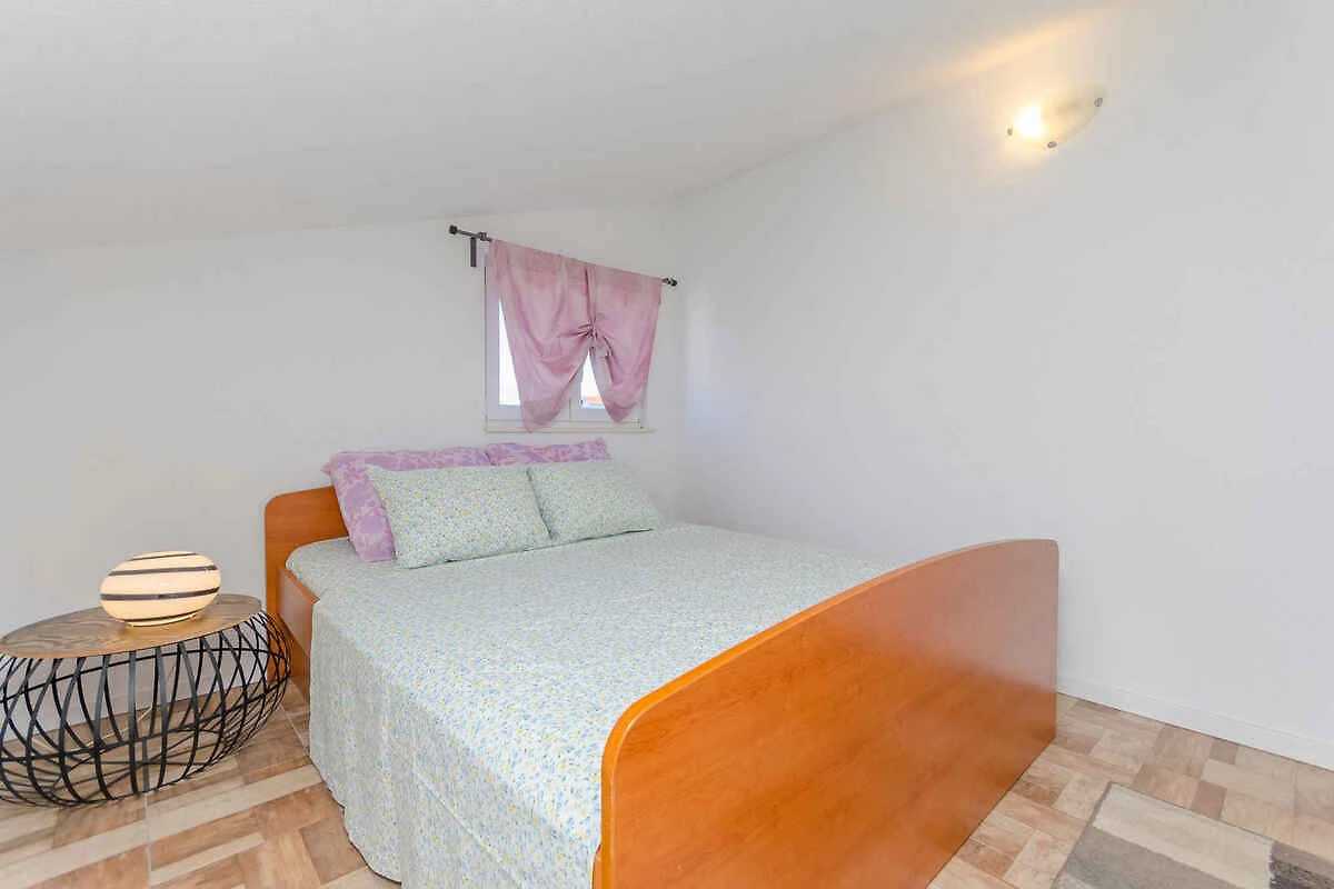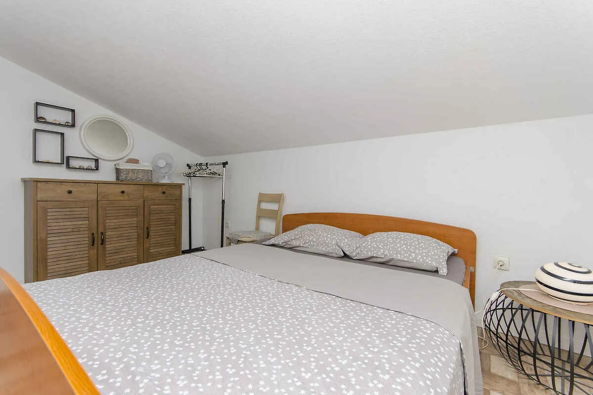 Wejście do Państwa apartamentu wakacyjnego znajduje się na 2. piętrze i prowadzi bezpośrednio do salonu. Salon (pomieszczenie przechodnie) z 2 dodatkowymi miejscami do spania na kanapie, TV, kącikiem jadalnym (4 miejsca) oraz wyjściem na taras (10 m², meble ogrodowe, 1 stół, 3 krzesła). Sypialnia (10 m²) z 1 łóżkiem podwójnym. Aneks kuchenny w salonie z klimatyzacją, kuchenką elektryczną (2 pola), piekarnikiem, lodówką (z zamrażalnikiem) oraz czajnikiem elektrycznym. Łazienka z prysznicem, 1 umywalką, WC i oknem.