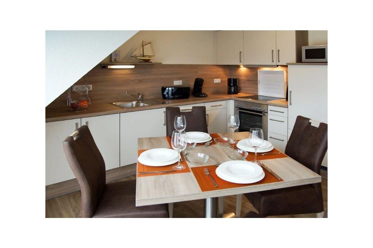 Można także spotkać się w przytulnej atmosferze w kuchni/jadalni. Elegancko wyposażona kuchnia jest w pełni wyposażona, dzięki czemu z kulinarnego punktu widzenia możesz poczuć się jak w domu. Tutaj masz do swojej dyspozycji okap, piekarnik, kuchenkę, ekspres do kawy, lodówkę, zmywarkę w aneksie kuchennym, kuchenkę mikrofalową, mikser, toster, a także naczynia, szklanki, kubki itp.
