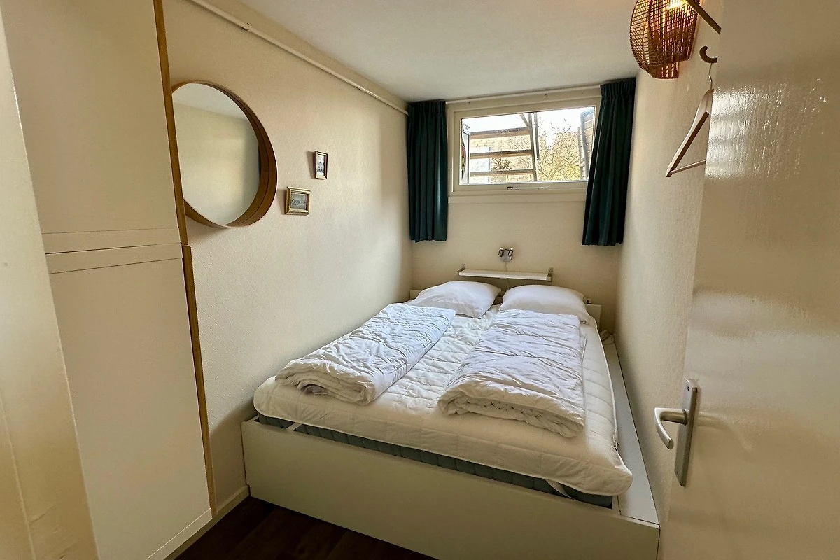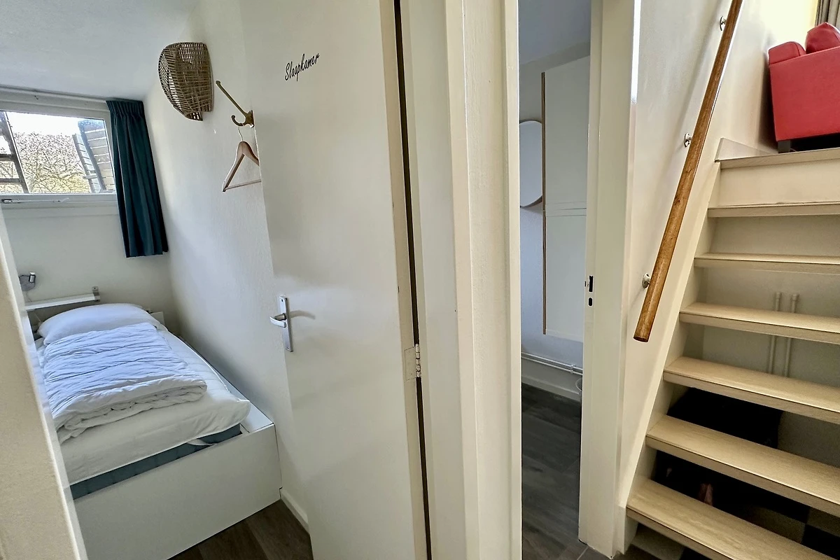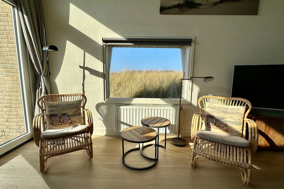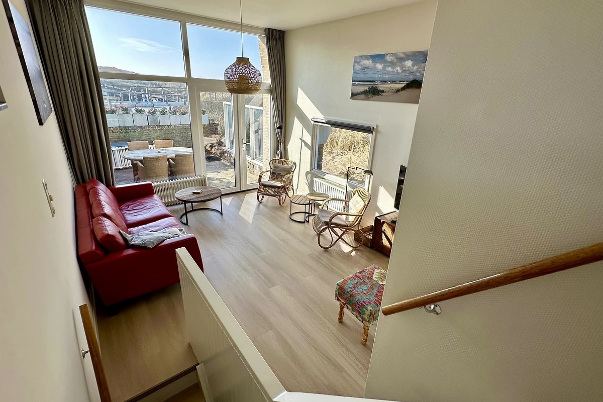 Wejście do domu prowadzi przez schody. Najpierw wchodzi się do otwartej kuchni. Kuchnia jest w pełni wyposażona, między innymi w maszynę do kawy Nespresso oraz do kawy filtracyjnej, mikrofalówkę z funkcją piekarnika itp. Obok znajduje się łazienka z prysznicem i umywalką. Po pokonaniu wąskich, niewielkich schodów dochodzi się do jasnego salonu, gdzie znajduje się wygodna sofa i telewizor zapewniające relaks. Z sofy roztacza się idylliczny widok na wydmy.