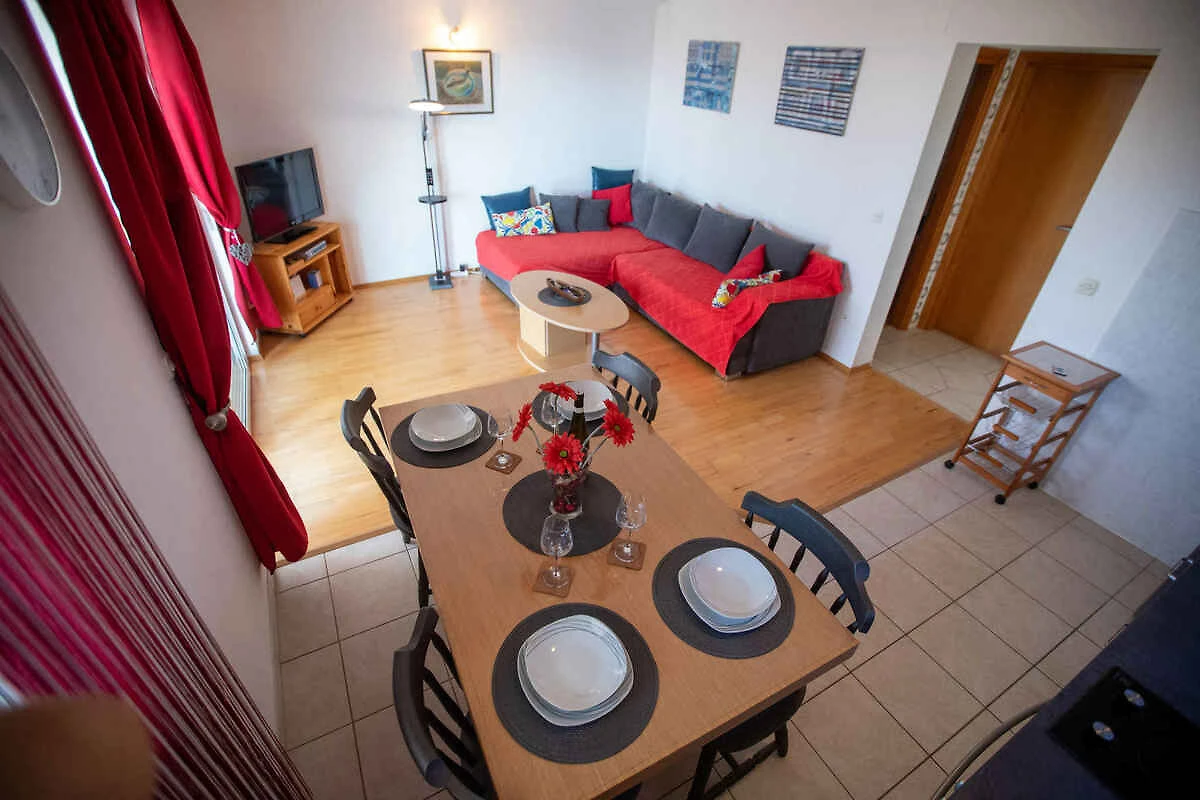 Wejście do Państwa mieszkania wakacyjnego znajduje się na 2. piętrze. Pokój dzienny (pokój przechodni) z 1 dodatkowym łóżkiem na rozkładanej podwójnej kanapie, kącikiem wypoczynkowym, TV, klimatyzacją i wyjściem na balkon. Sypialnia (11 m²) z 2 łóżkami pojedynczymi. Sypialnia (13 m²) z 1 łóżkiem podwójnym. Aneks kuchenny w pokoju dziennym z jadalnią (6 miejsc), kuchenką gazową (4 palniki), piekarnikiem, zmywarką, lodówką (z zamrażalnikiem), ekspresem do kawy i czajnikiem elektrycznym. Łazienka z prysznicem, 1 umywalką, WC i oknem.