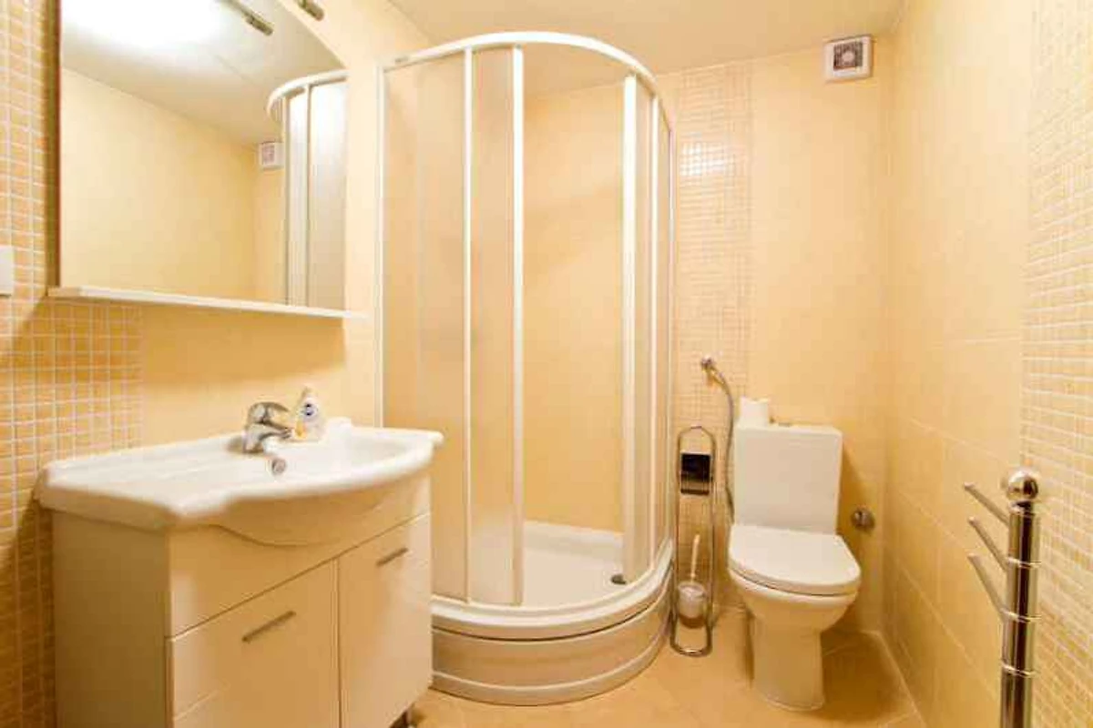 Wejście do Państwa apartamentu wakacyjnego znajduje się w suterenie i prowadzi przez zewnętrzne schody oraz 10 m² taras bezpośrednio do kuchni z salonem. Pokój dzienny (15 m², pokój przechodni, nieogrzewany) z kącikiem wypoczynkowym, TV, klimatyzacją, jadalnią (3 miejsca) i wyjściem na taras. Sypialnia (15 m², nieogrzewana) z 1 łóżkiem podwójnym. Kuchnia (pokój przechodni, nieogrzewana) z klimatyzacją, jadalnią, kuchenką elektryczną (indukcyjną, 4 palniki), piekarnikiem, zmywarką, lodówką i ekspresem do kawy. Łazienka (8 m², nieogrzewana) z prysznicem, 1 umywalką, WC i suszarką do włosów.