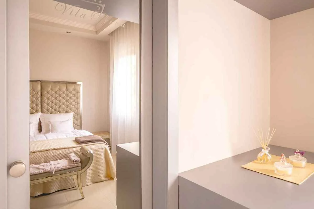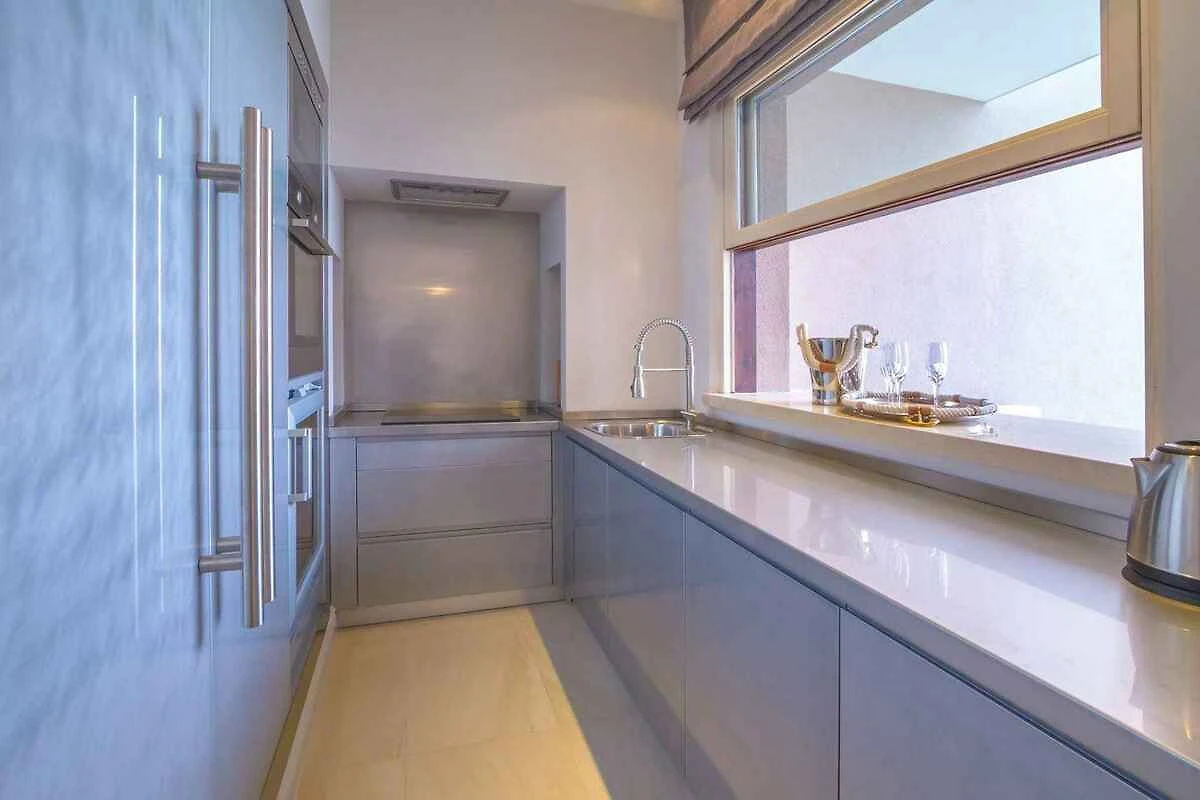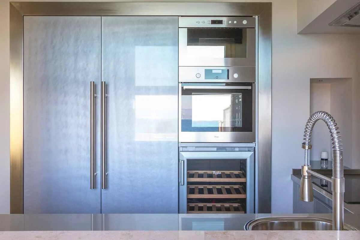 Salon (pokój przechodni) z częścią wypoczynkową, TV, klimatyzacją i jadalnią. 3 sypialnie każda z 1 łóżkiem podwójnym i klimatyzacją. Sypialnia z 1 łóżkiem piętrowym i klimatyzacją. Aneks kuchenny w salonie z kuchenką elektryczną, piekarnikiem, okapem, zmywarką, lodówką (zamrażalnik), kuchenką mikrofalową, ekspresem do kawy, tosterem i czajnikiem elektrycznym. Łazienka z wanną, pralką, WC, suszarką do włosów i oknem. 3 łazienki każda z prysznicem, WC, suszarką do włosów i oknem.