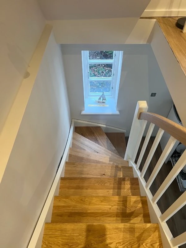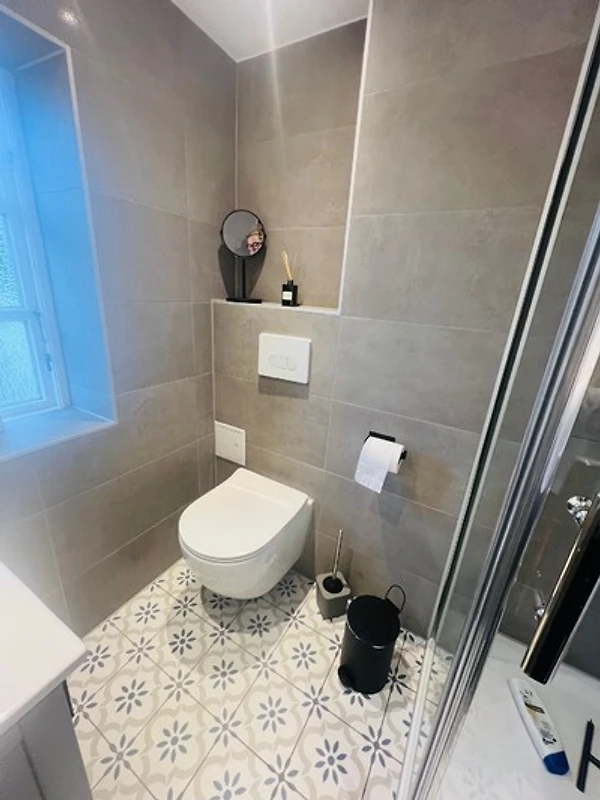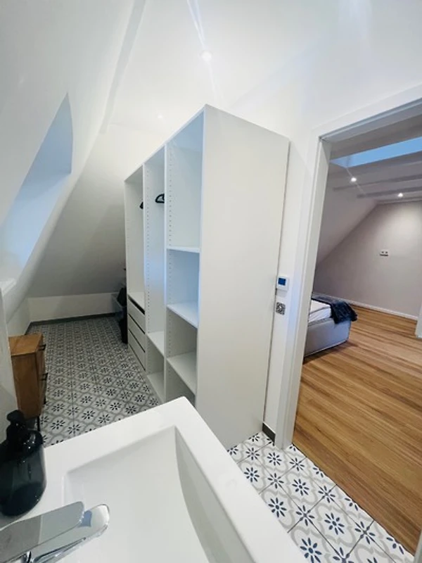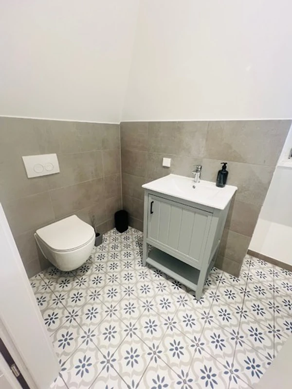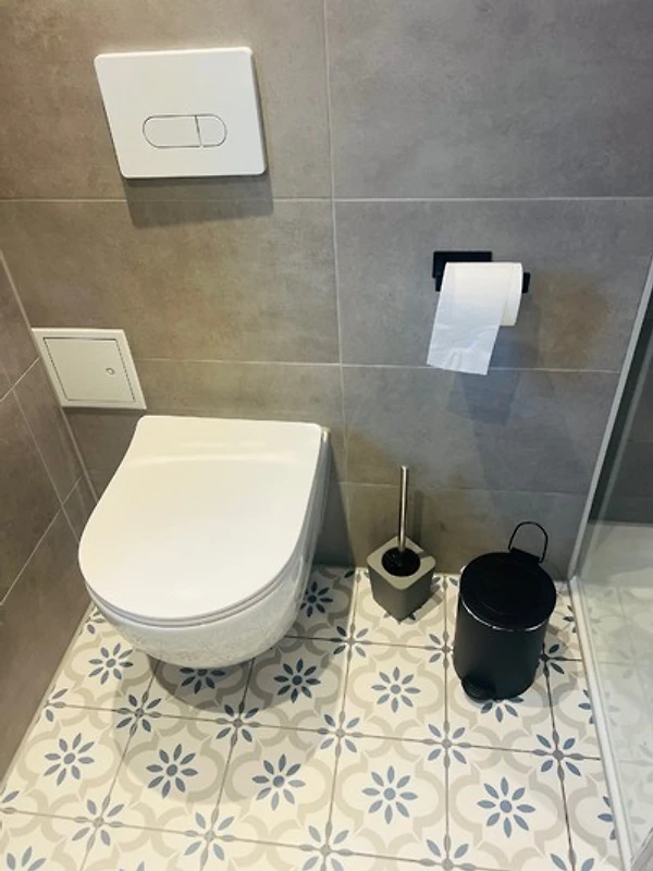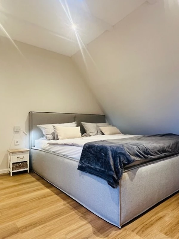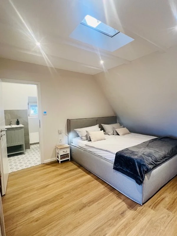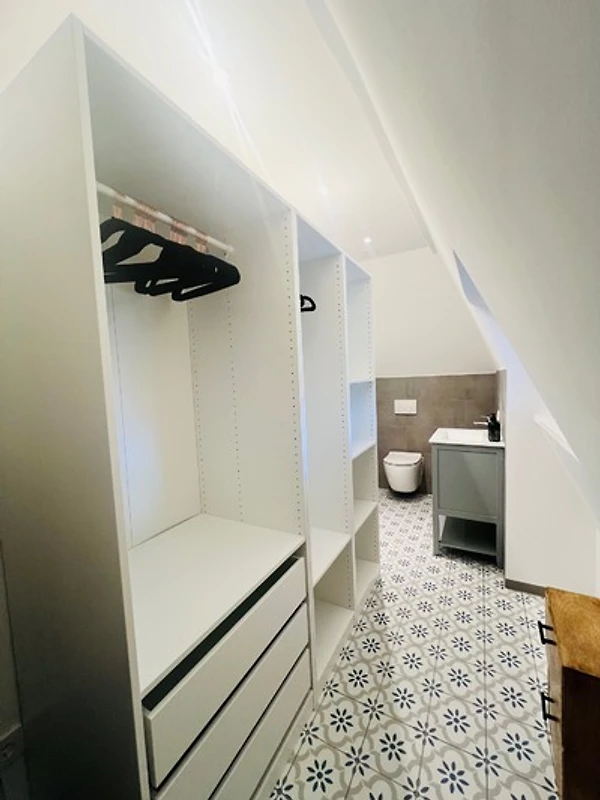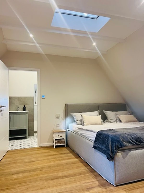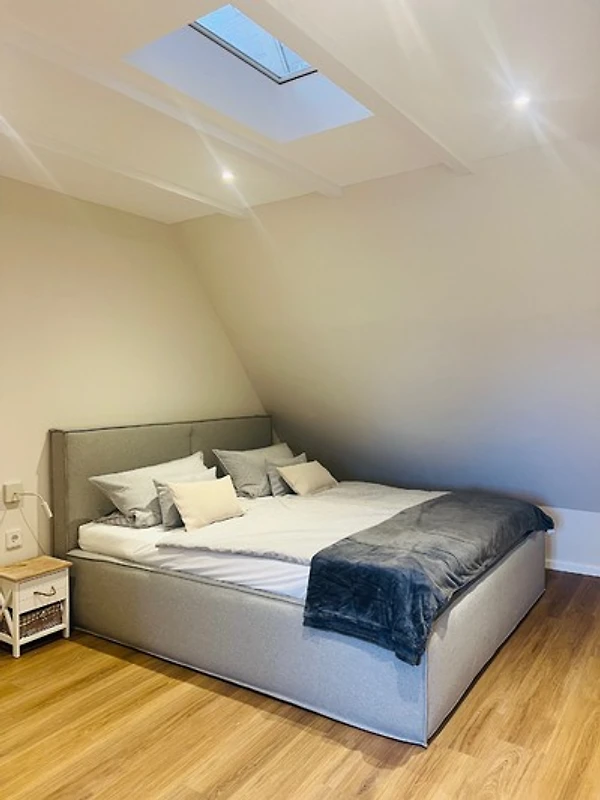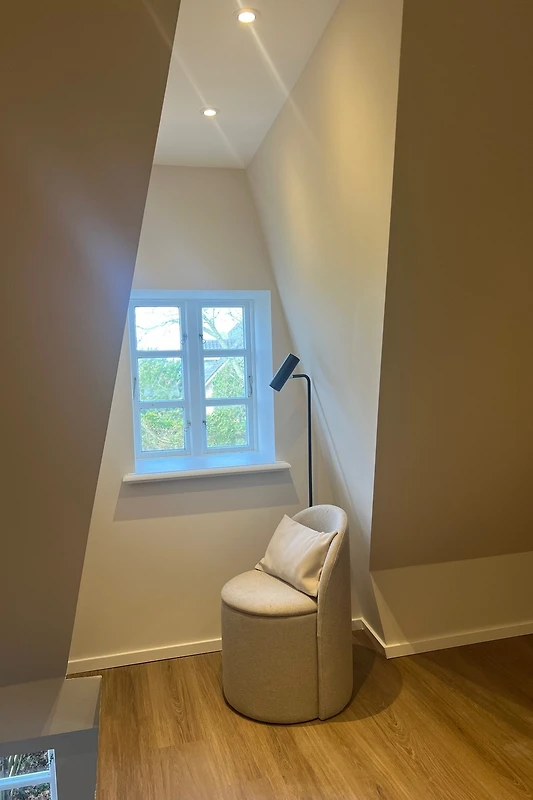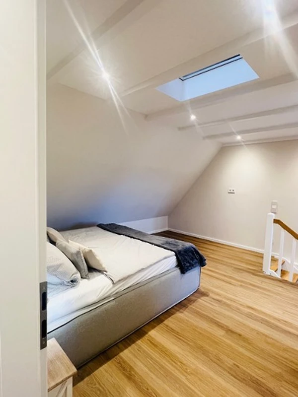 Na parterze znajduje się również łazienka z prysznicem i WC. Na piętrze znajduje się nowoczesna sypialnia (łóżko kontynentalne 180 x 200 cm) z garderobą, dodatkowa toaleta oraz przytulny kącik do czytania.
