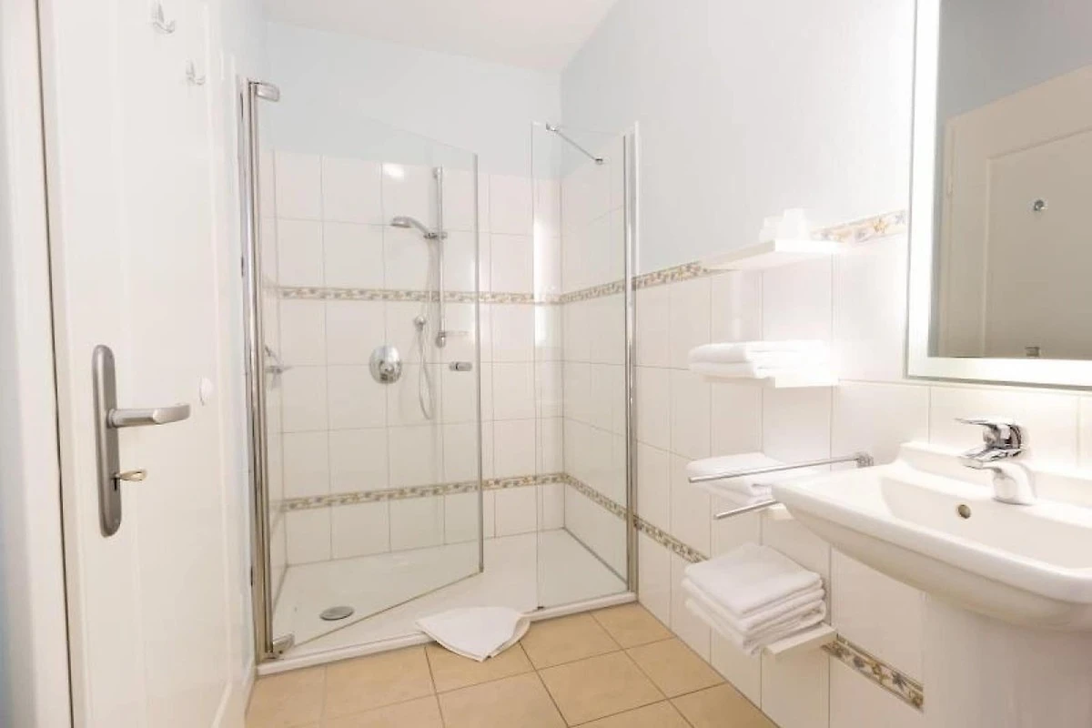 Dwie łazienki są elegancko urządzone i każda z nich wyposażona jest w prysznic lub wannę.