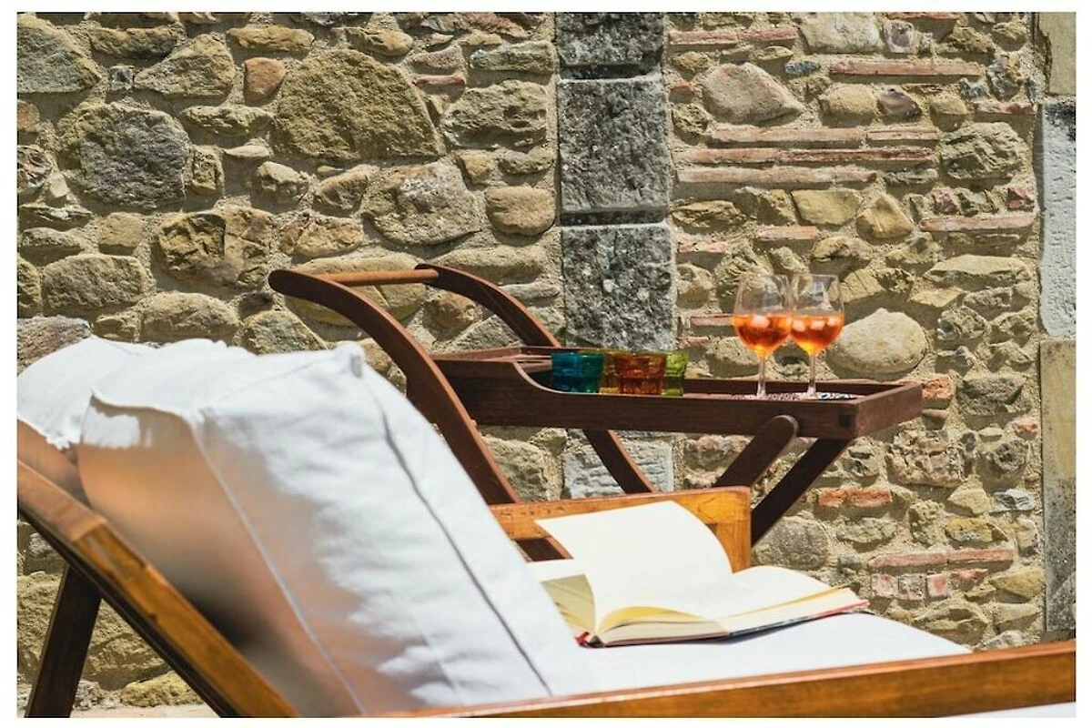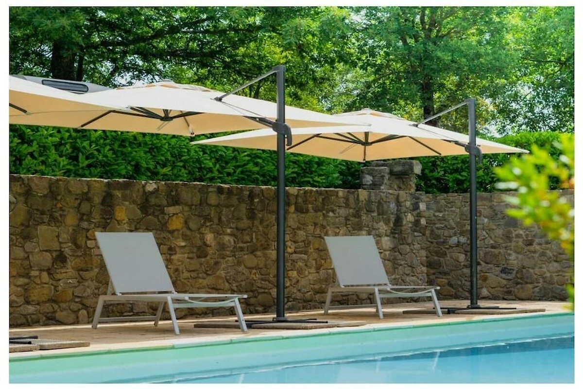 Na zewnątrz znajduje się również prywatny parking na 5 samochodów oraz piękny basen (o wymiarach 12 x 6 m, czynny od maja do września), wyposażony w parasole i leżaki. Z basenu roztacza się wspaniały widok na okolicę.