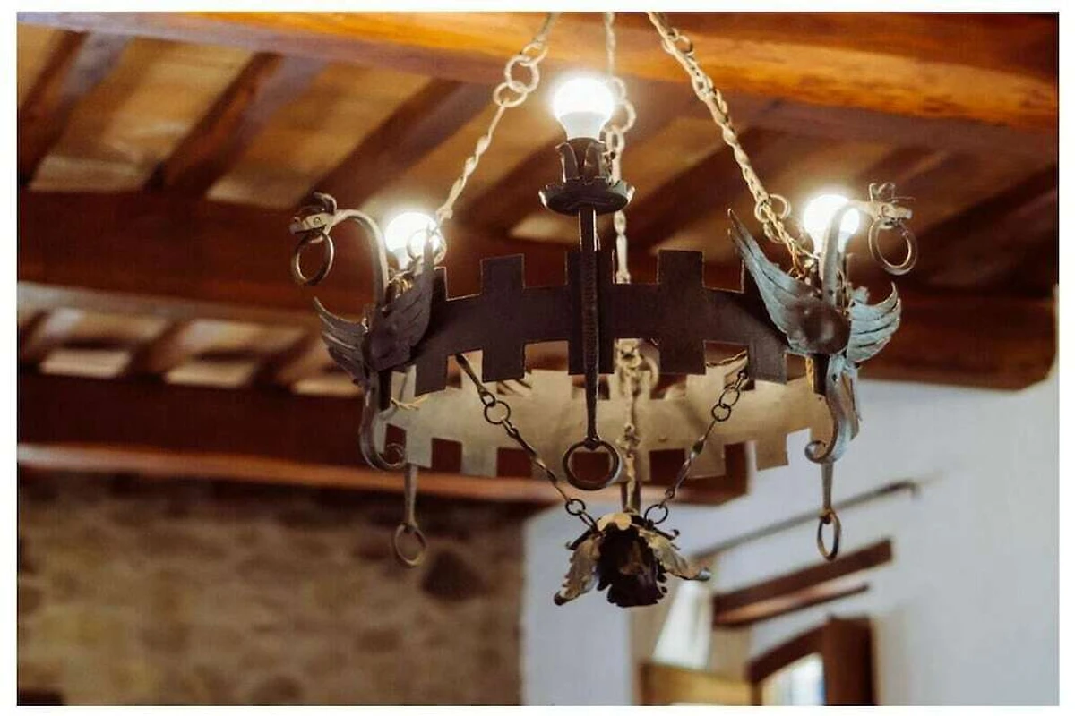 Na piętrze znajduje się salon z sofą, kominkiem i telewizorem. Znajduje się tam również łazienka z prysznicem oraz sypialnia z łóżkiem małżeńskim i łóżkiem z baldachimem.