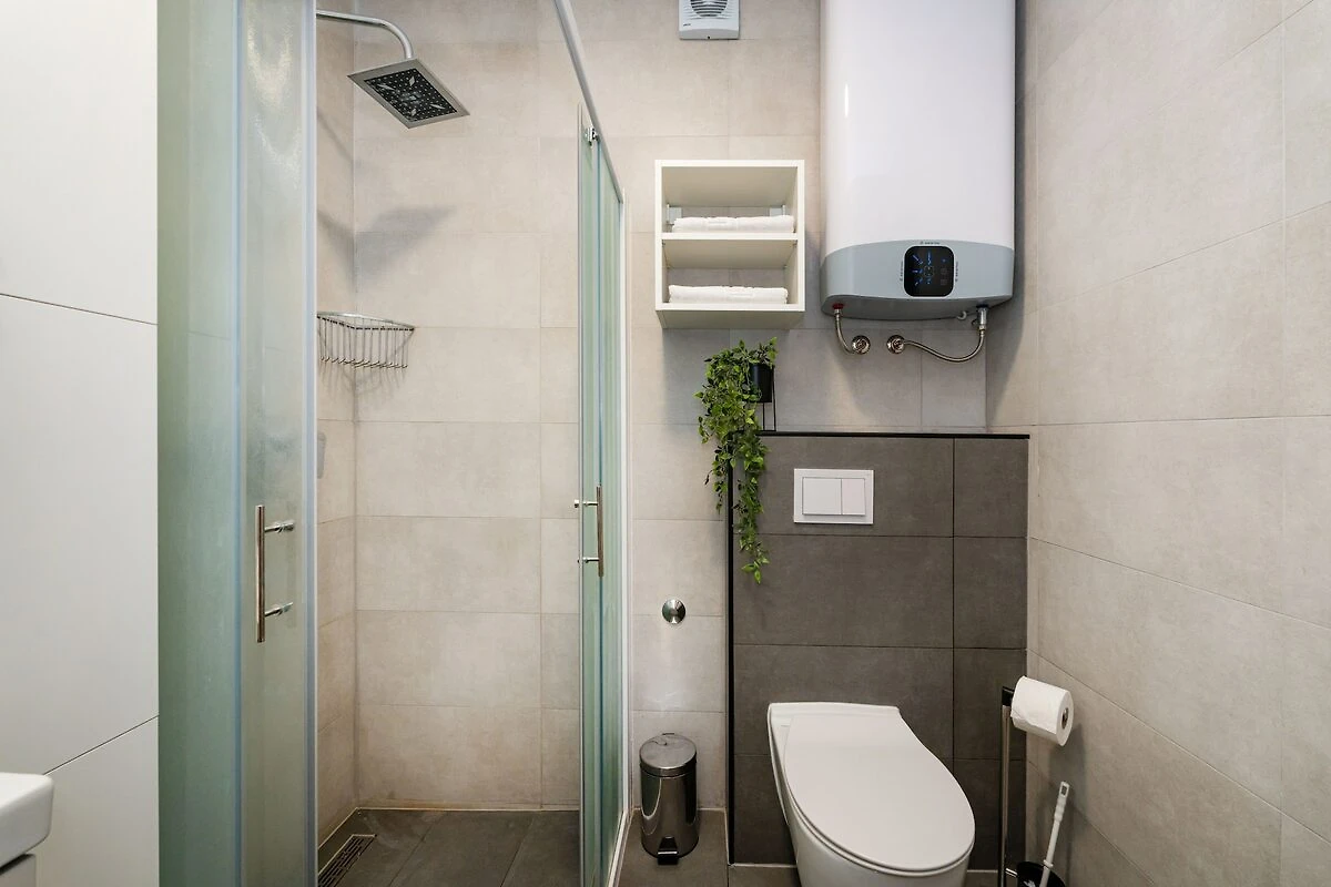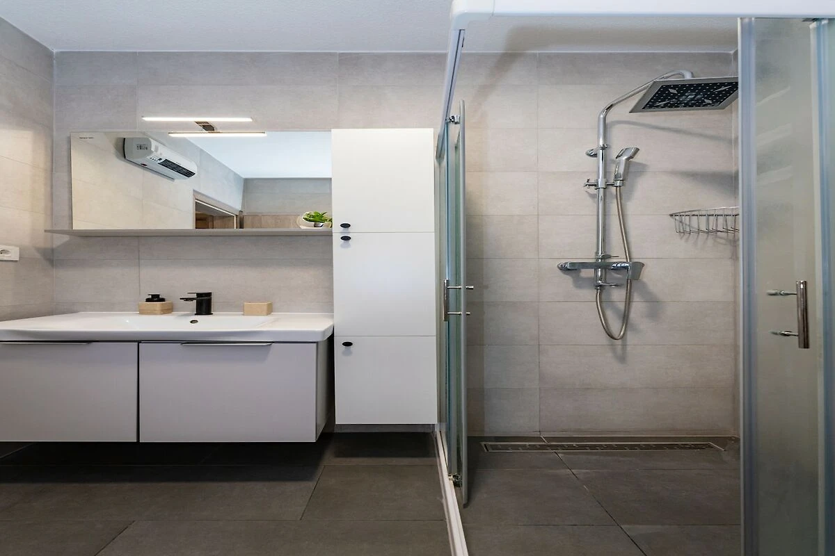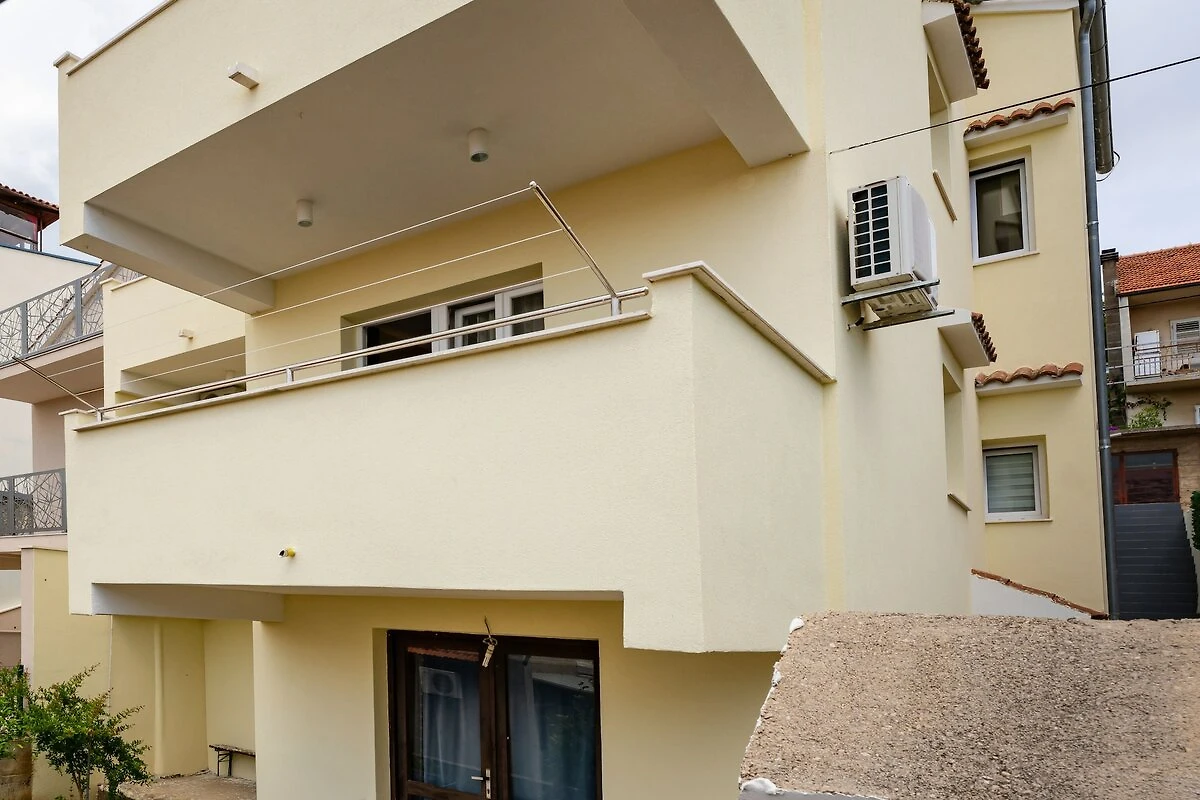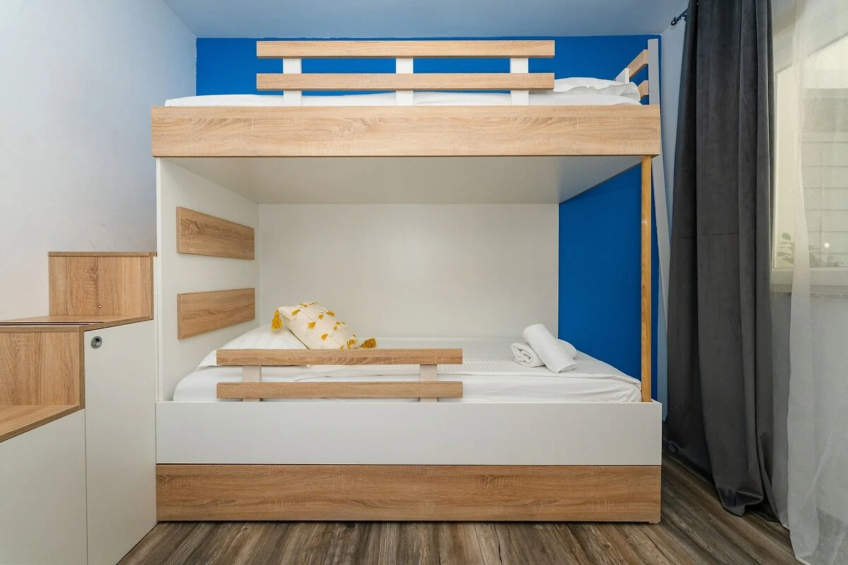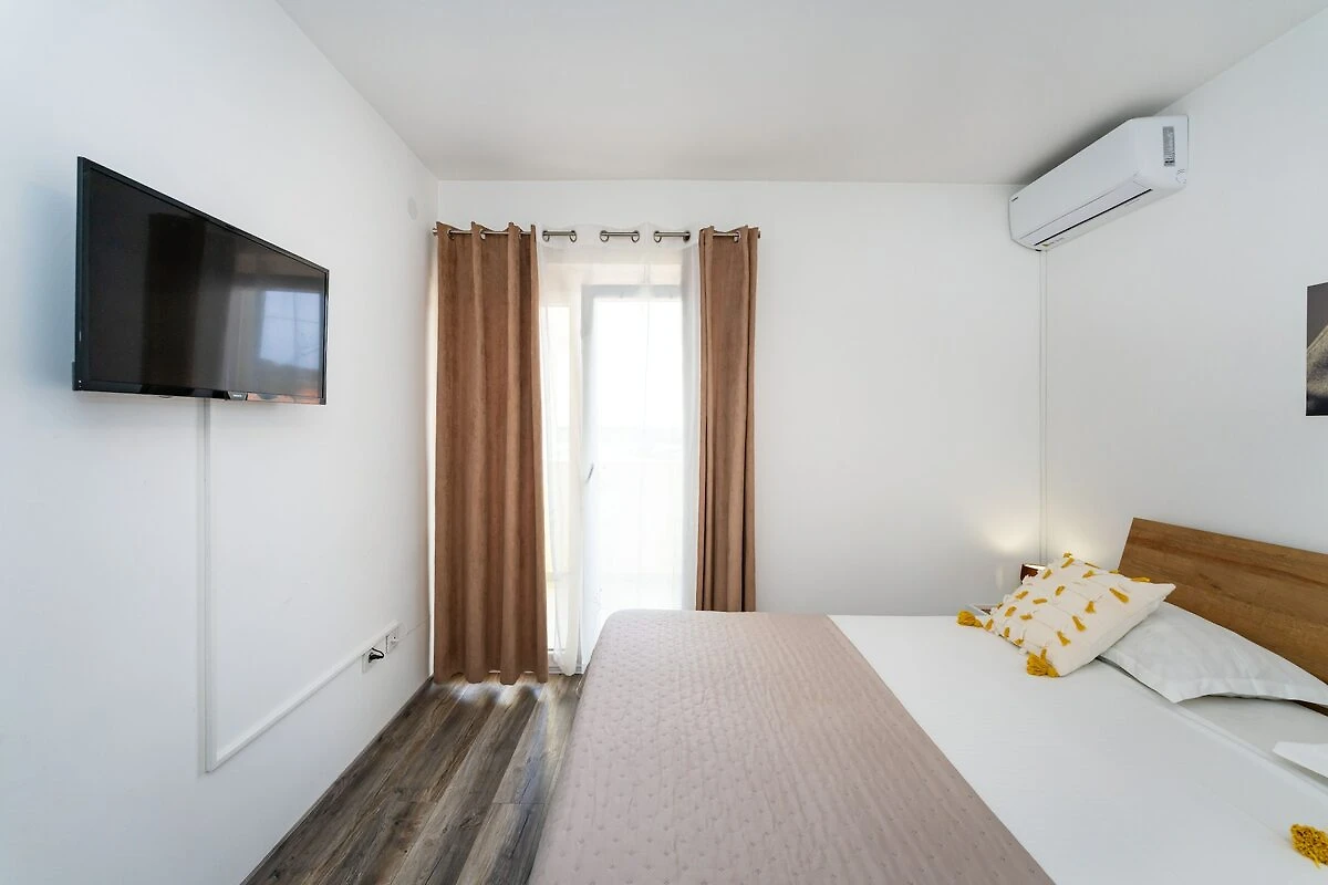 Wnętrze jest jasne, nowoczesne i zaprojektowane z myślą o relaksie. Możesz wyjść na balkon z widokiem na morze, aby cieszyć się porannym powietrzem, lub zrelaksować się w jasnym, klimatyzowanym salonie z jadalnią, gdzie duży telewizor oferuje Netflix na przytulne wieczory. W pełni wyposażona kuchnia z kuchenką gazowo-elektryczną, piekarnikiem, lodówko-zamrażarką i zmywarką ułatwia przygotowywanie posiłków we własnym zakresie. Na zewnątrz znajduje się mały ogródek z kamiennym grillem, idealnym do grillowania obiadu. W apartamencie znajduje się również szybkie Wi-Fi, żelazko i suszarka do włosów, dzięki czemu wszystkie niezbędne rzeczy są zaspokojone.