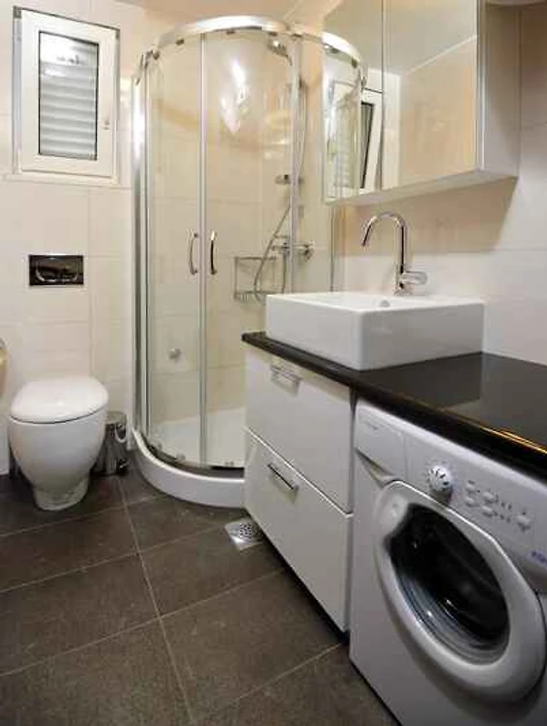 i prowadzi po zewnętrznych schodach bezpośrednio do salonu. Salon z 1 dodatkowym łóżkiem na kanapie/sofie (odpowiednie dla dzieci poniżej 11 lat), kącikiem wypoczynkowym, TV oraz wyjściem na taras (meble ogrodowe, 1 stół, 4 krzesła). 2 sypialnie każda z 1 łóżkiem małżeńskim. Kuchnia z jadalnią (6 miejsc), kuchenką elektryczną (płyta indukcyjna, 4 pola), piekarnikiem, lodówką (zamrażalnik), ekspresem do kawy, elektrycznym czajnikiem oraz wyjściem na balkon. Łazienka z prysznicem, 1 umywalką i WC. Łazienka z pralką, prysznicem, 1 umywalką i WC.