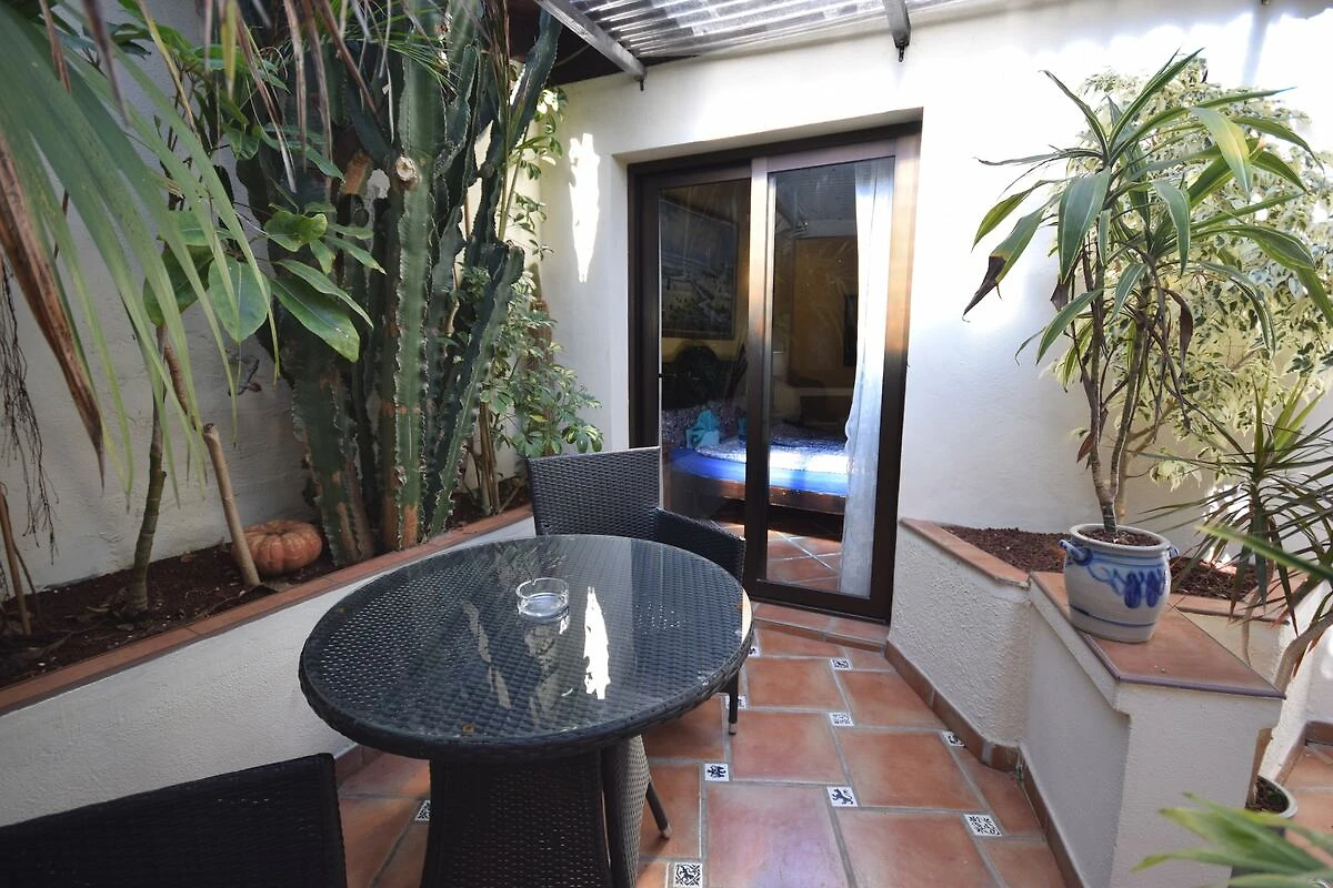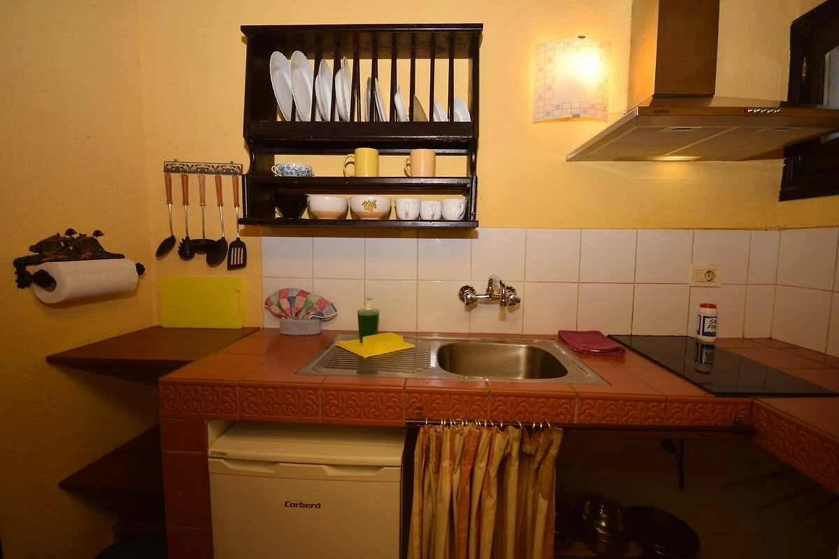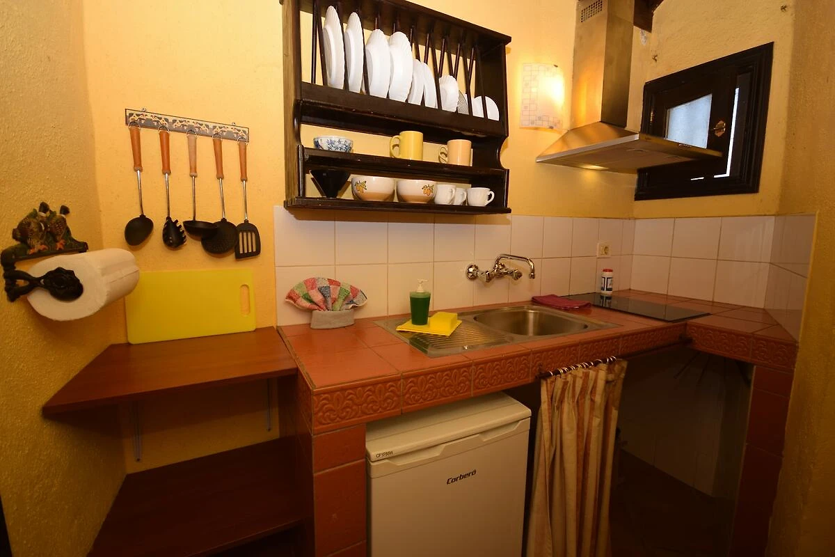 Ten przestronny, rustykalny apartament wakacyjny (ok. 45 m²) znajduje się na parterze. Jest to obiekt przeznaczony wyłącznie dla osób dorosłych, bez wyżywienia i usług sprzątania. Apartament oferuje komfortowy salon z jadalnią, dobrze wyposażoną kuchnię oraz gustownie urządzoną sypialnię. Kluczowym elementem jest uroczy, prywatny kącik wypoczynkowy na małym tarasie, który stanowi uroczą przestrzeń do relaksu na świeżym powietrzu. Cicha sypialnia wychodzi na ten dziedziniec i oferuje bezpośrednie wyjście na taras, a małe okno w salonie wychodzi na główną ulicę i zapewnia częściowy widok na morze.