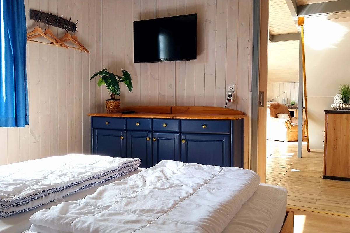 Dom wakacyjny jest wyposażony we wszystkie udogodnienia, komfortowy i oferuje dużo przestrzeni. Ogrzewanie podłogowe w łazience i salonie oraz kominek zapewniają przytulne ciepło dla każdego i o każdej porze roku. Nasz bogato wyposażony dom wakacyjny z 6 łóżkami + 1 sofą do spania, odtwarzaczem DVD, miniwieżą stereo (radio/CD), 3 telewizorami w salonie, sypialni i pokoju dziecięcym, bezpłatnym Wi-Fi, nową kuchnią z kuchenką, płytą ceramiczną, piekarnikiem, kuchenką mikrofalową, zmywarką, tosterem, ekspresem do kawy, czajnikiem oraz lodówką i zamrażarką, a także sauną, pralką i suszarką do włosów zapewnia przyjemną atmosferę do wypoczynku. Duży, słoneczny taras południowo-zachodni z wygodnymi meblami ogrodowymi, parasolem, grillem zewnętrznym oraz 2 miejscami parkingowymi bezpośrednio przed domem oferuje dodatkowe udogodnienia. Również dla psów posesja zapewnia wystarczająco dużo miejsca do wybiegu.