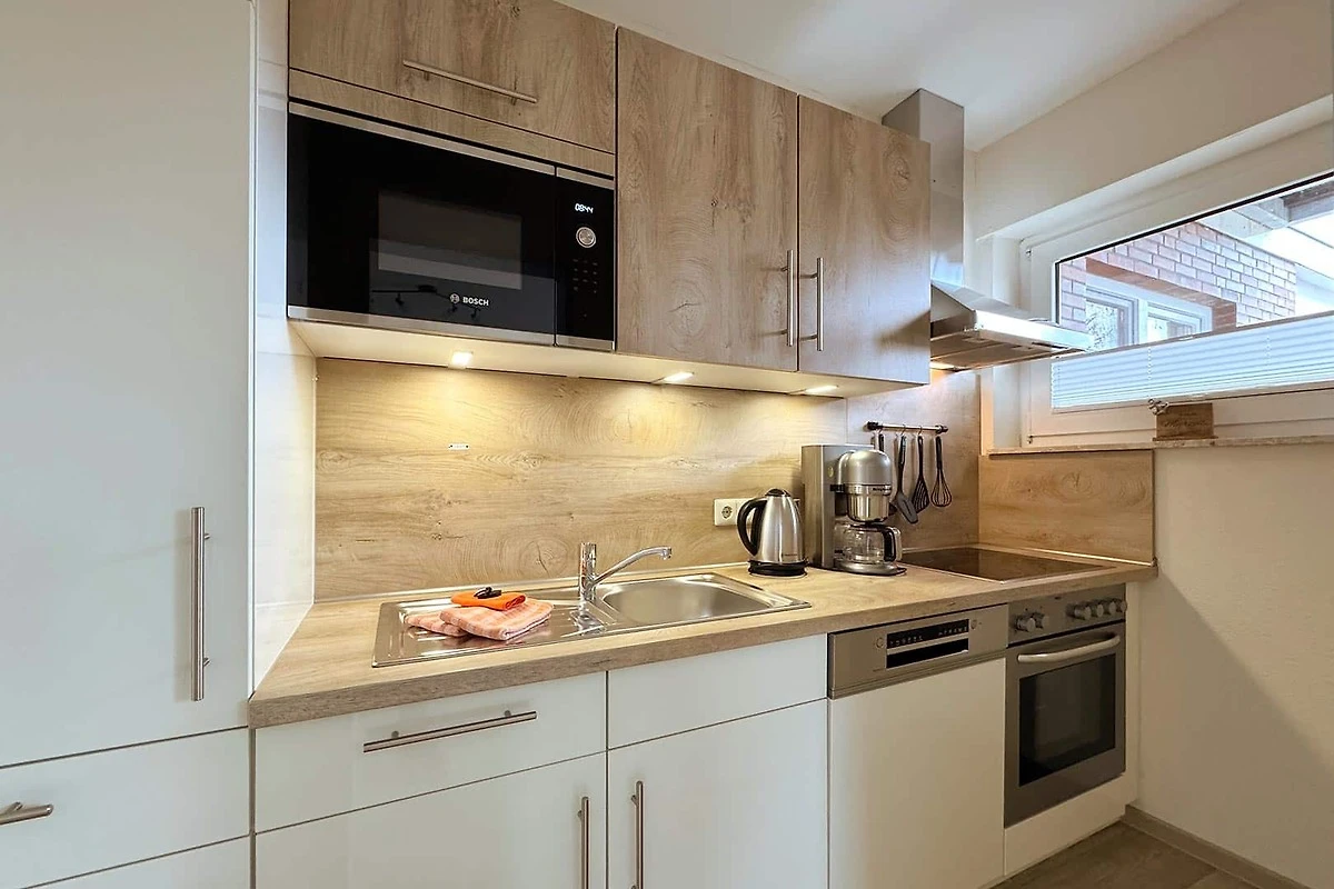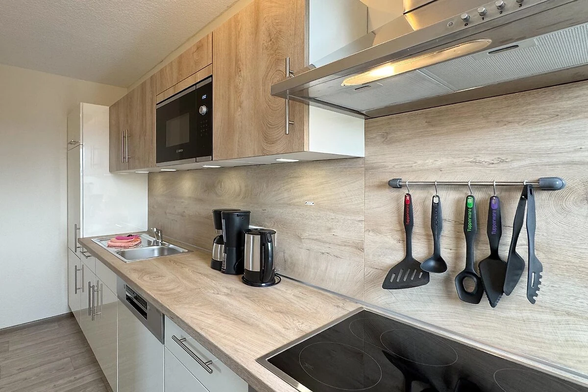 Oferujemy gustowne i pięknie urządzone mieszkania wakacyjne. W kuchniach dominuje kolor bukowy. Są one wyposażone w zmywarkę, kuchenkę elektryczną (częściowo z piekarnikiem) lub mikrofalówkę z piekarnikiem, toster, ekspres do kawy itp. i nie pozostawiają prawie nic do życzenia.