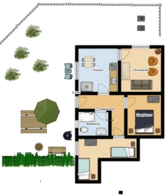 Kolejne trzy nowe łazienki i nowa oddzielna kuchnia z całkowicie nowym wyposażeniem. Do ogrodu wchodzi się przez schodzącą ścieżkę obok drzwi wejściowych. W ogrodzie znajduje się drewniany domek ogrodowy z krzesłami ogrodowymi oraz różne drzewa owocowe (jabłoń, śliwa, wiśnia i orzech włoski)