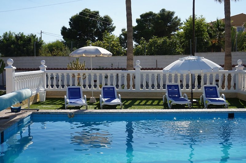 W dom z basenem znajduje się na zamkniętej działce o powierzchni 2500 m². Składa się on z głównego i wtórnego domu, elastycznie podzielna. W sumie jest 6 sypialni, 4 łazienki i 3 kuchnie. W głównym budynku znajdują się 3 sypialnie, 2 łazienki oraz w pełni wyposażoną kuchnię ze zmywarką do naczyń. Piękny zadaszony taras oferuje widok Alicante, do zamku św Barbary i morza.