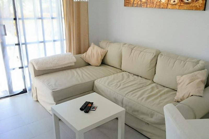 Salon wyposażony jest w sofę, która może być używana jako łóżko (2m długości i 1,60 m szerokości), na wynajem ponad 2 osób, TV ława