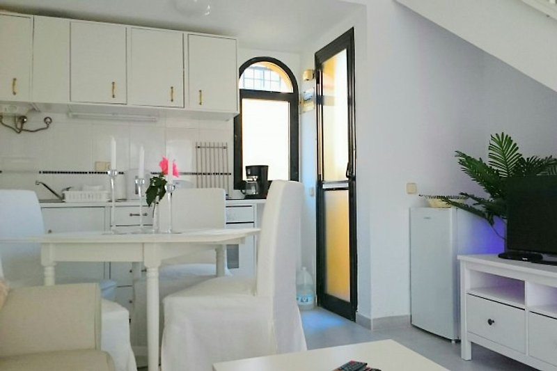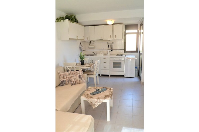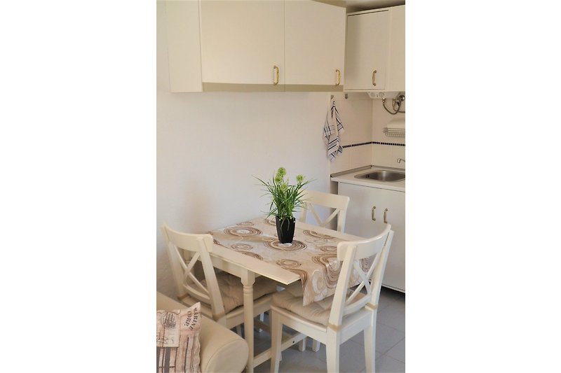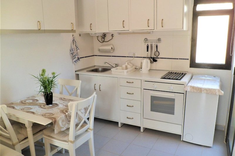 Wyposażenie kuchenne (2 palniki), piekarnik, lodówka z małym zamrażalnikiem, ekspres do kawy, toster, czajnik, garnki, patelni, zapiekanki, itp, a także naczynia, szklanki, kieliszki, sztućce i co musimy do gotowania. Poza kuchni jest stół z 4 krzesłami.