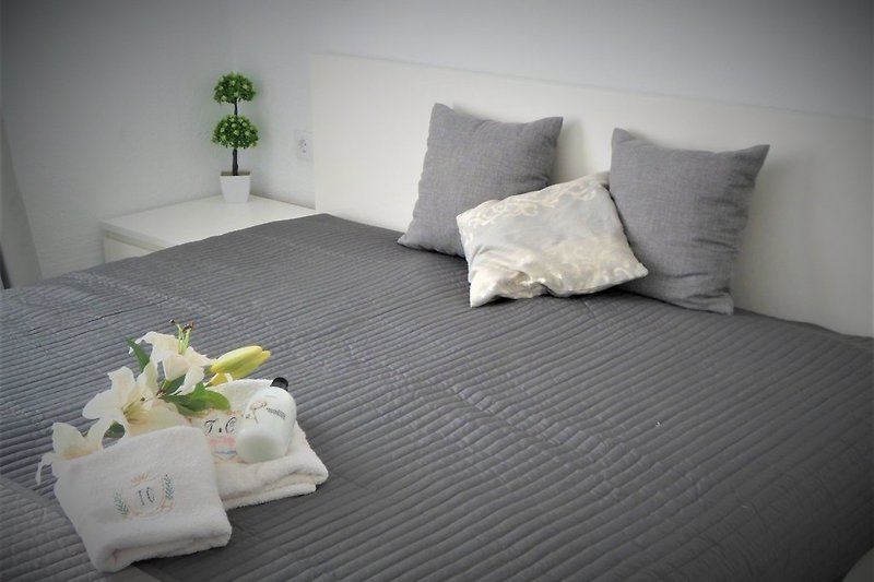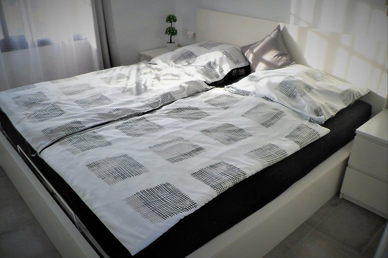 Wyposażony w duże łóżko (2m x 2m) i 2 stoliki nocne i duża komoda i szafa z dużą ilością miejsca.